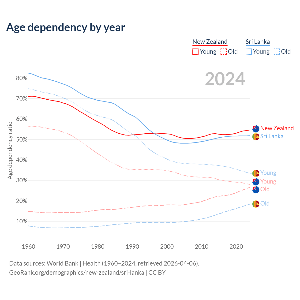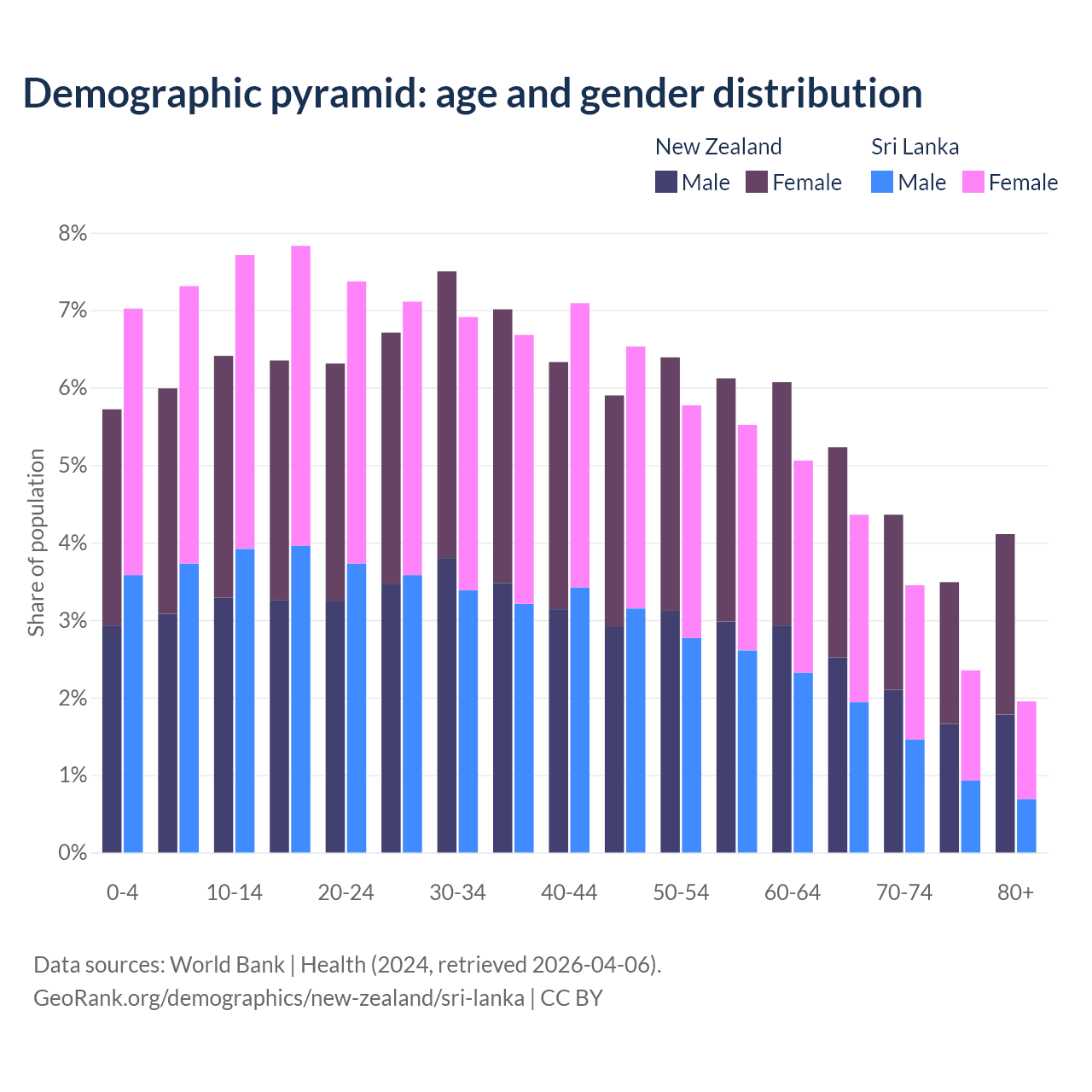 - New Zealand is ranked 56/196 by median age (oldest to youngest) vs 81/196 for Sri Lanka.