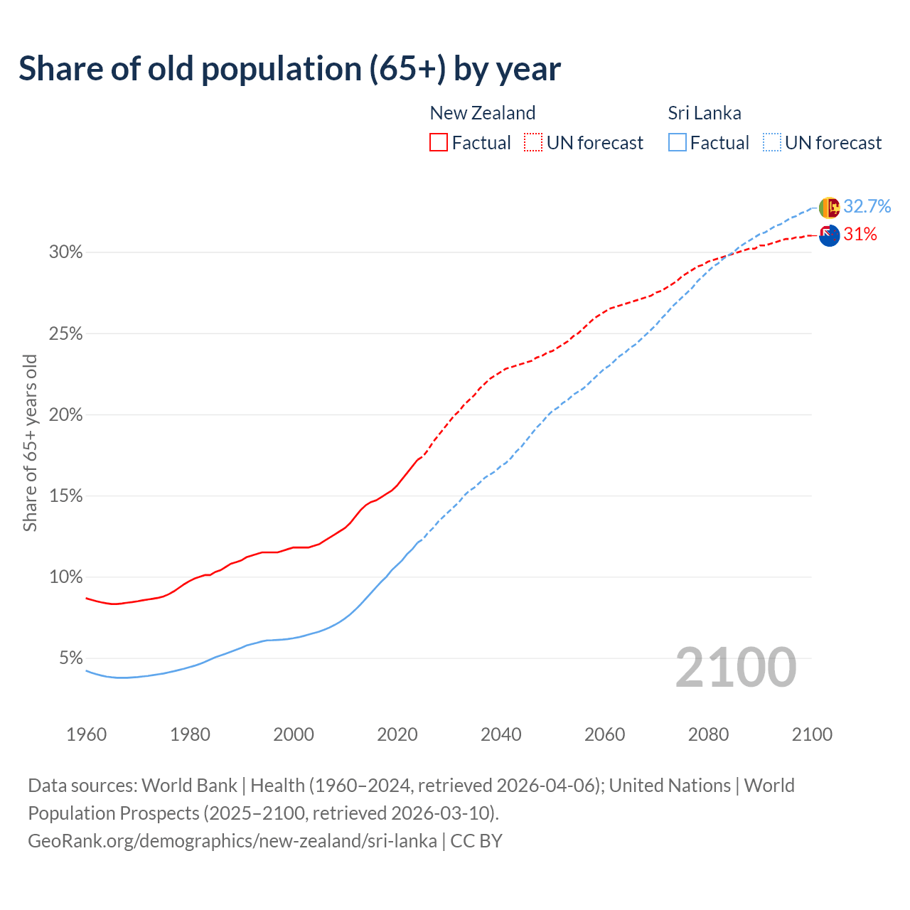 The share of older people aged 65 and over is 17.2% in New Zealand and 12.1% in Sri Lanka. Life expectancy in New Zealand compared to Sri Lanka .