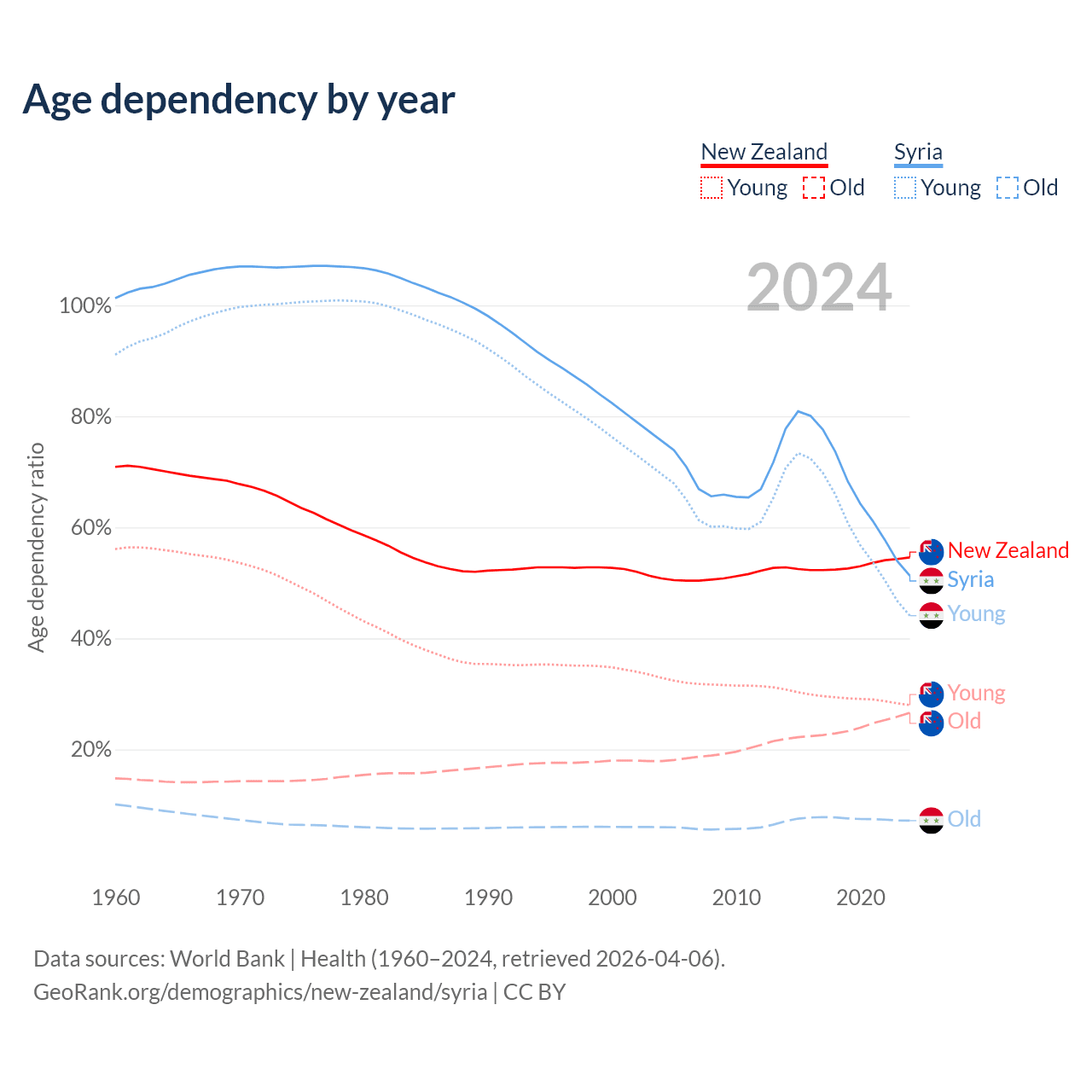 The share of older people aged 65 and over is 17.2% in New Zealand and 4.74% in Syria. Life expectancy in New Zealand compared to Syria .