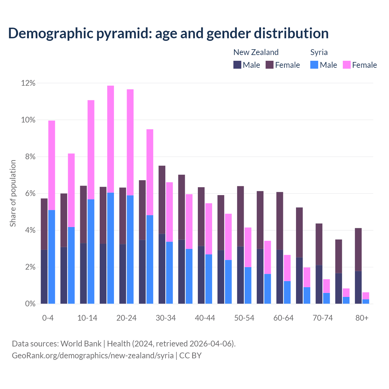 - As of 2026, the population of New Zealand is 5.37M vs 26.8M in Syria - 4.99 times difference.