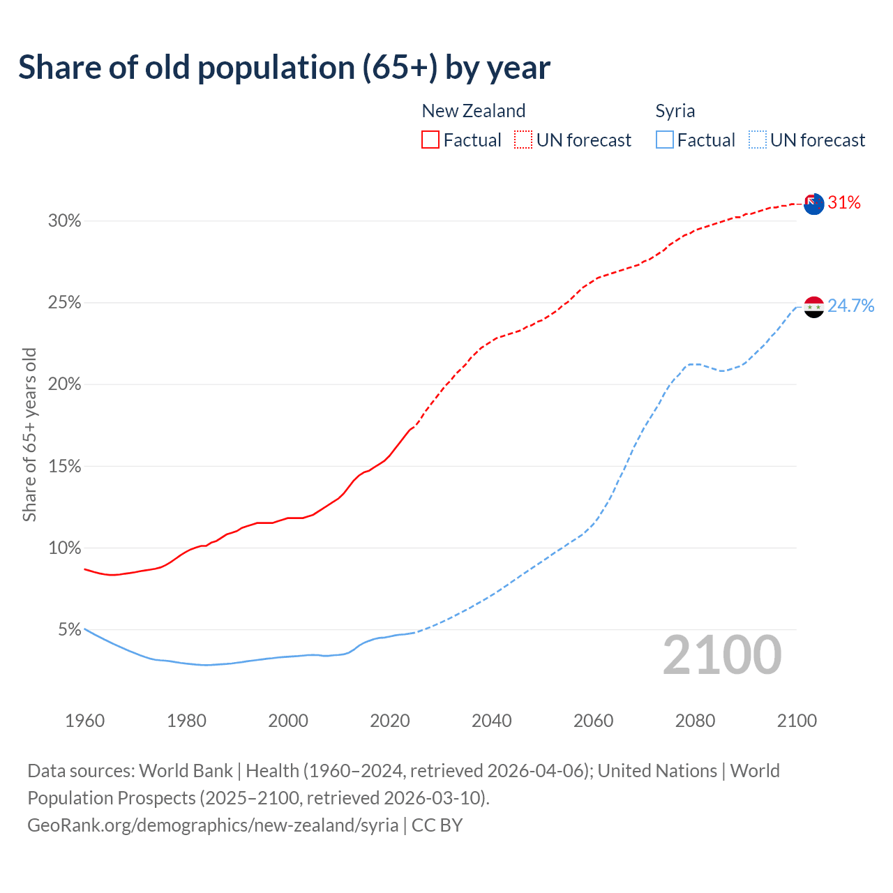 - The share of old-age demographic (65+) in New Zealand is 17.2% vs 4.74% in Syria.