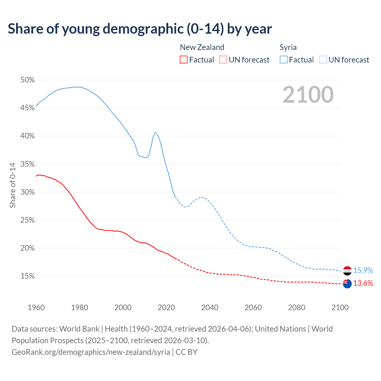 - The share of young demographic (0-15 years old) in New Zealand is 18.1% vs 29.2% in Syria.