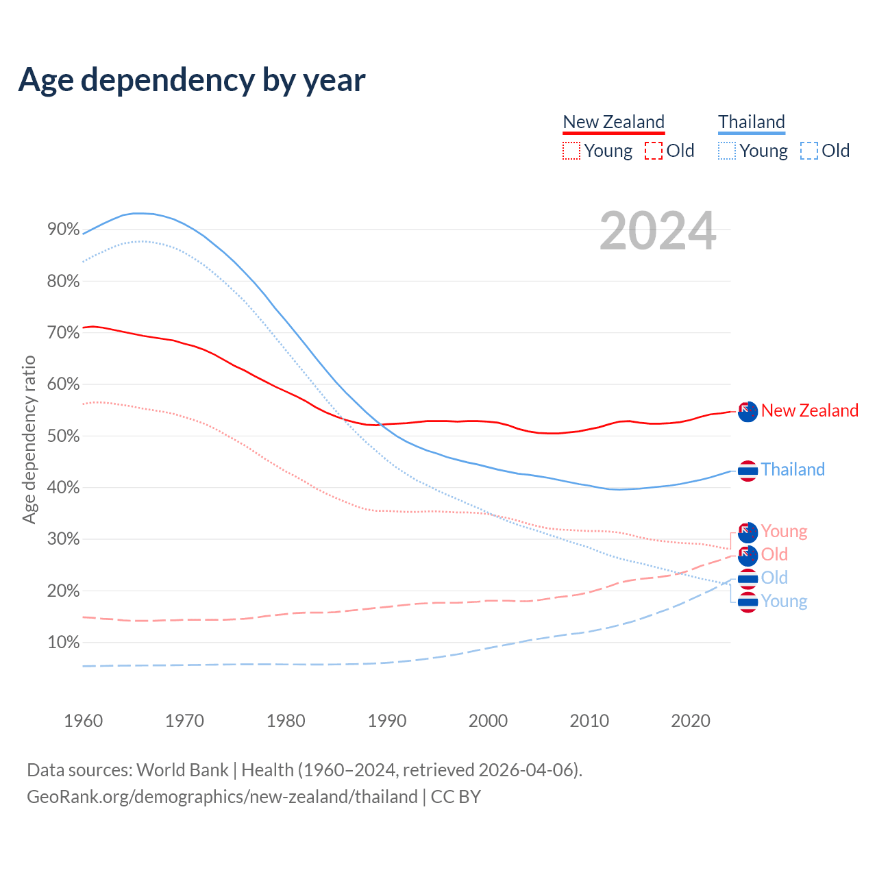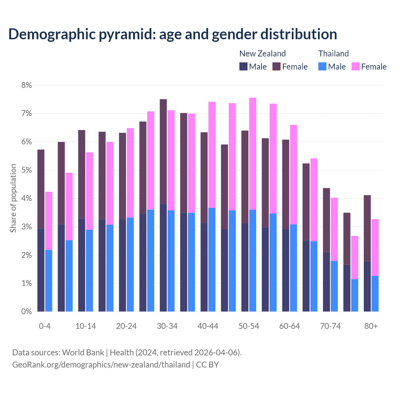 - New Zealand is ranked 56/196 by median age (oldest to youngest) vs 40/196 for Thailand.