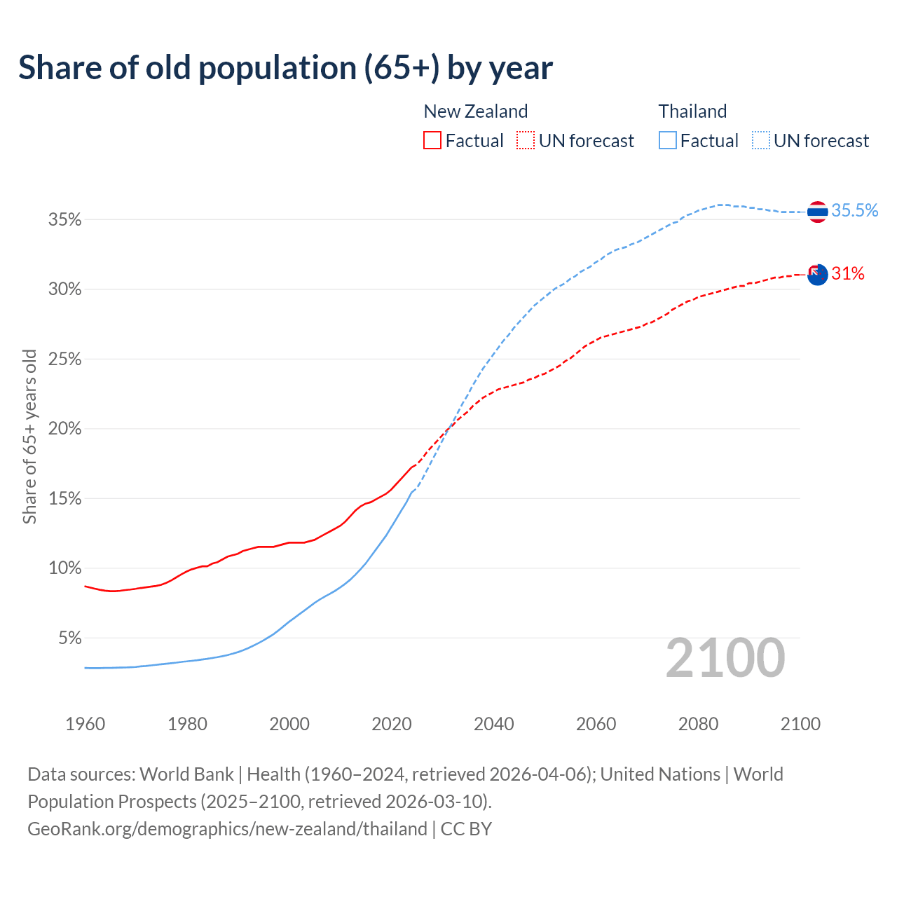 The share of older people aged 65 and over is 17.2% in New Zealand and 15.4% in Thailand. Life expectancy in New Zealand compared to Thailand .