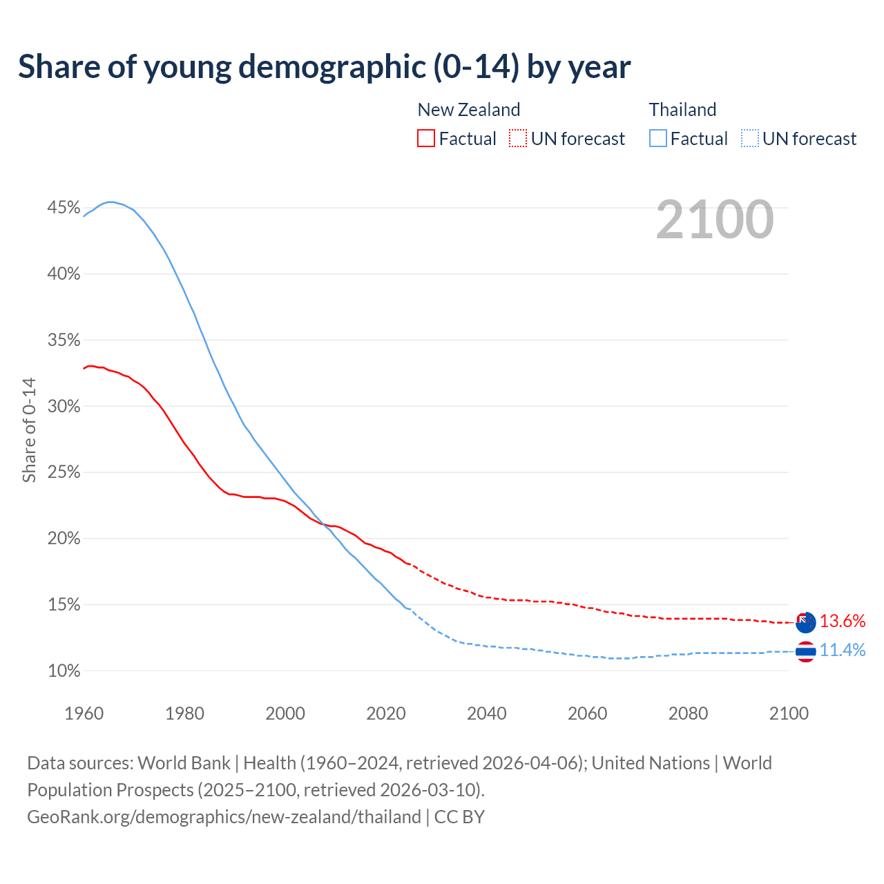 - The share of young demographic (0-15 years old) in New Zealand is 18.1% vs 14.7% in Thailand.