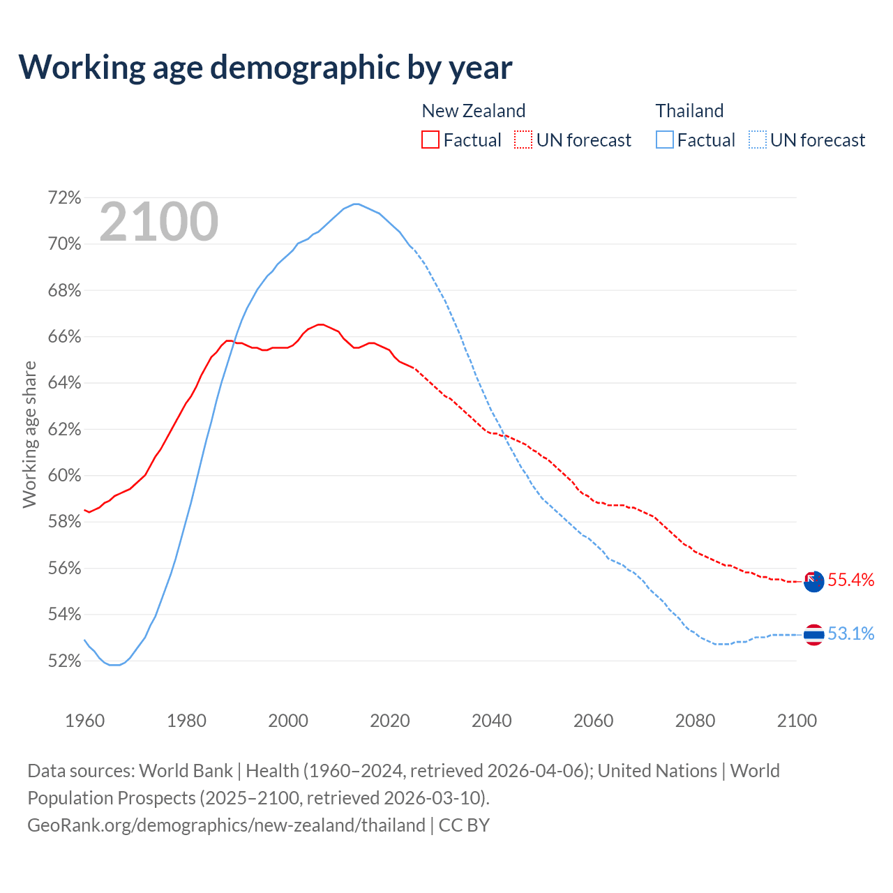- New Zealand has 3.48M working age adults (aged 15-64) vs 50M in Thailand.
