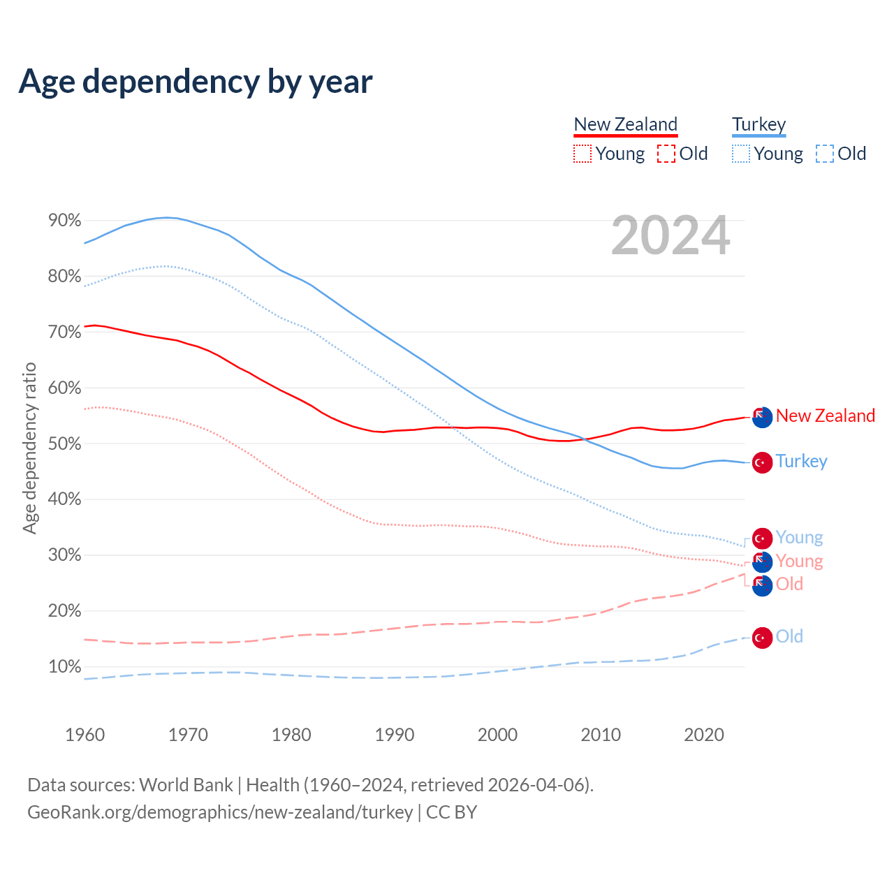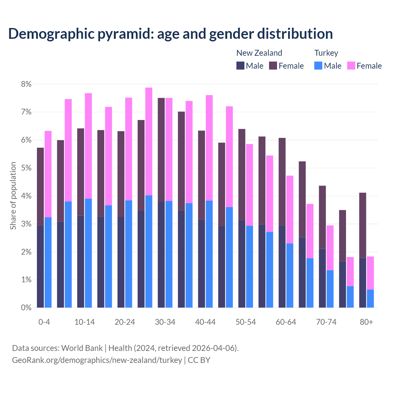 - New Zealand is ranked 56/196 by median age (oldest to youngest) vs 83/196 for Turkey.
