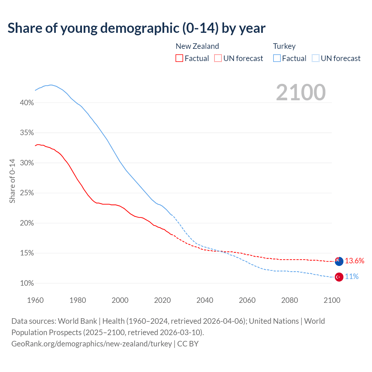 - The share of young demographic (0-15 years old) in New Zealand is 18.1% vs 21.4% in Turkey.