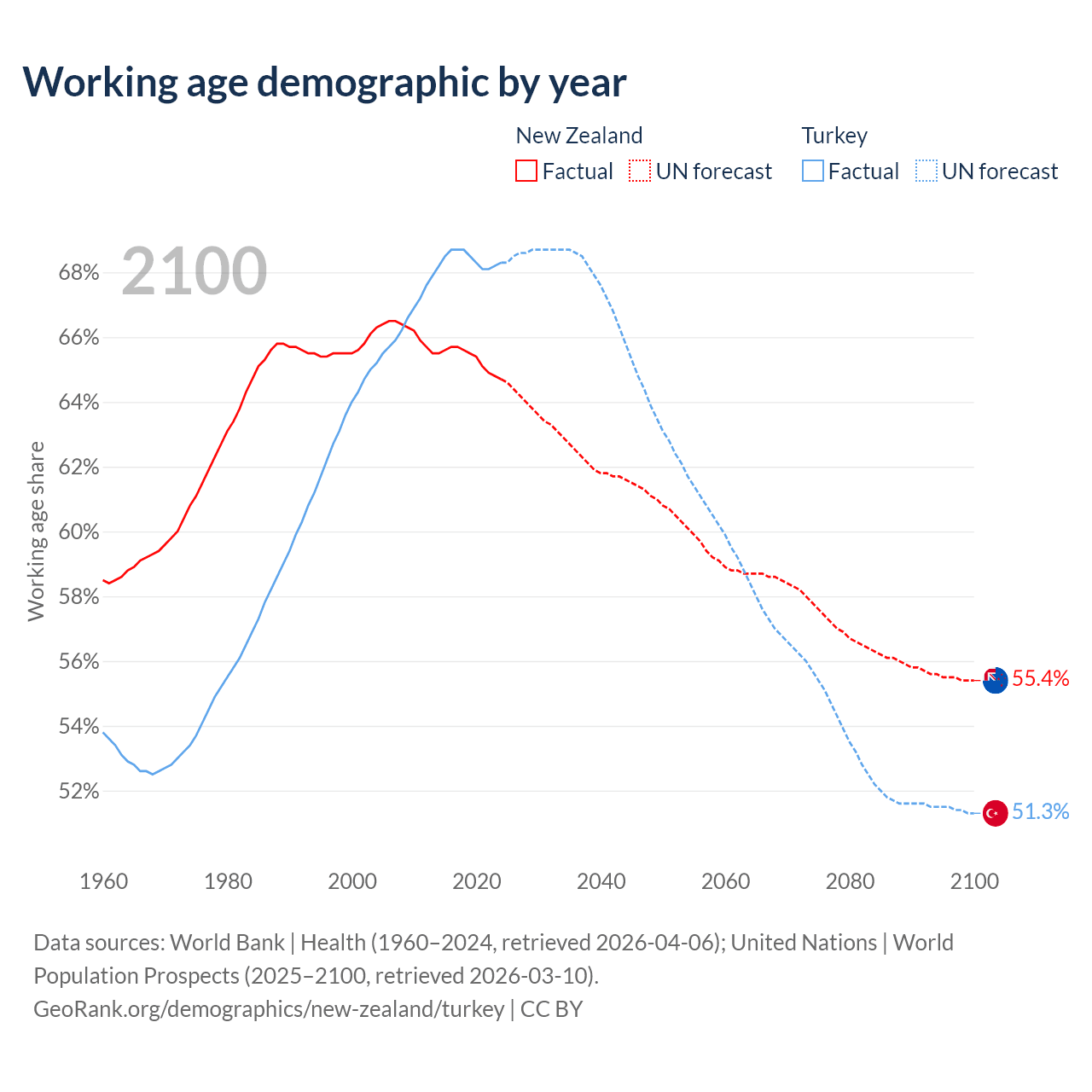 - New Zealand has 3.48M working age adults (aged 15-64) vs 58.7M in Turkey.