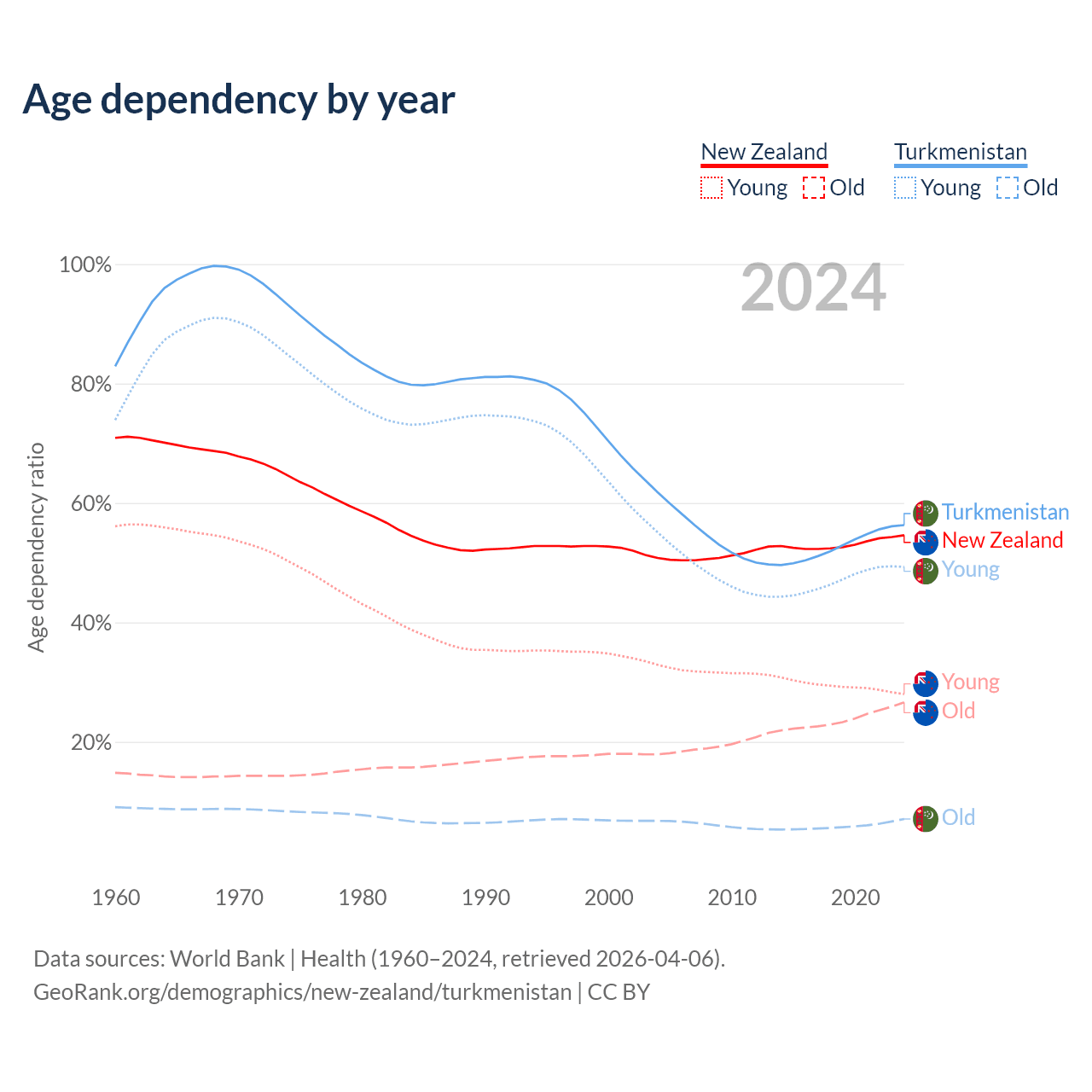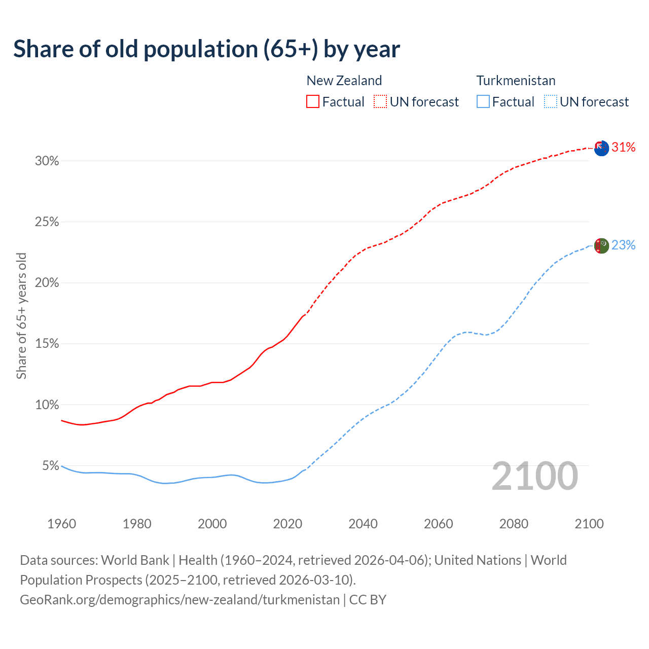 - The share of old-age demographic (65+) in New Zealand is 17.2% vs 4.53% in Turkmenistan.