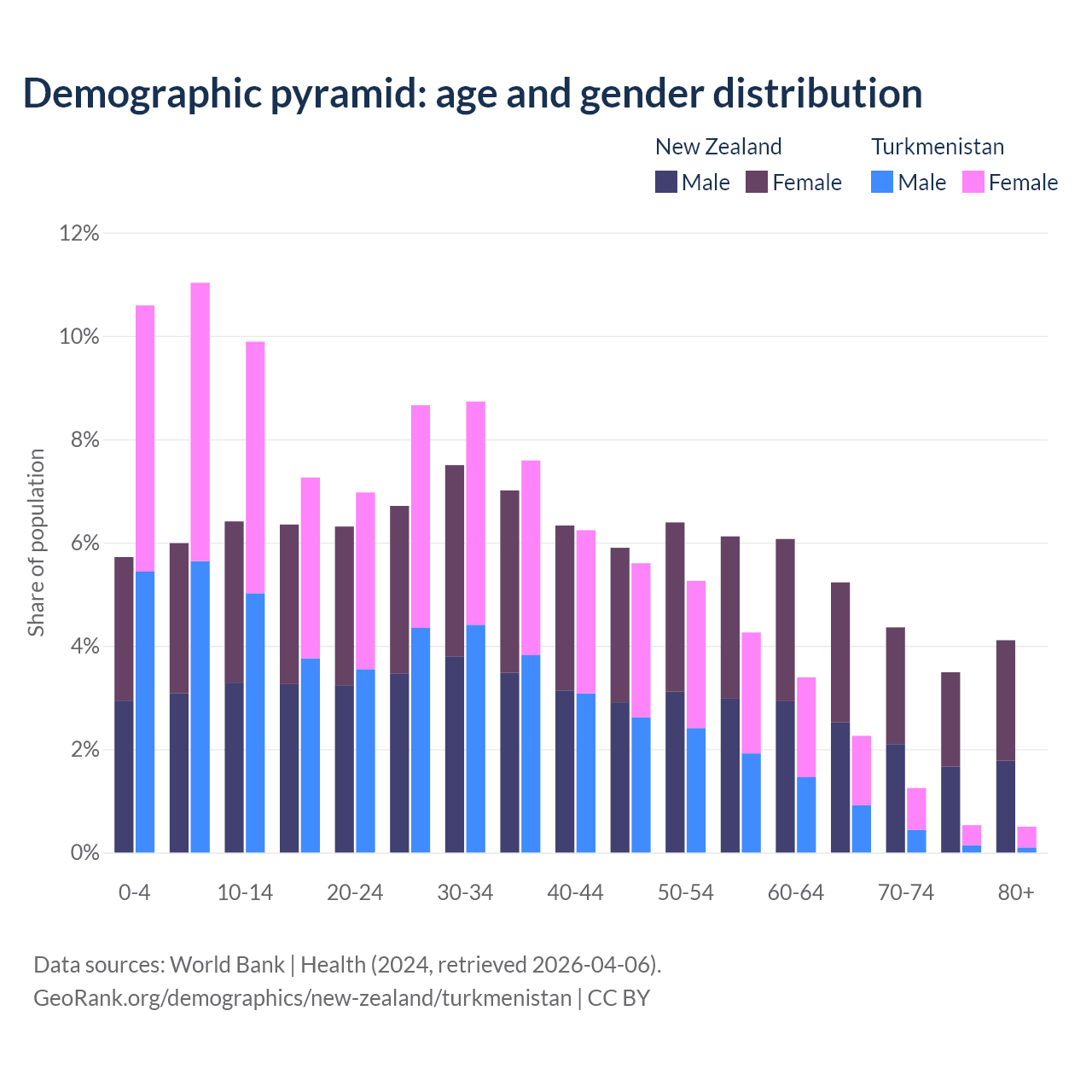 - New Zealand is ranked 56/196 by median age (oldest to youngest) vs 119/196 for Turkmenistan.