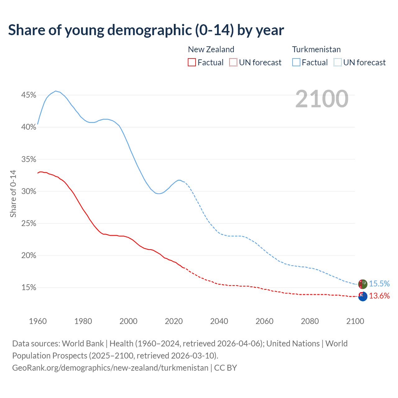 - The share of young demographic (0-15 years old) in New Zealand is 18.1% vs 31.5% in Turkmenistan.