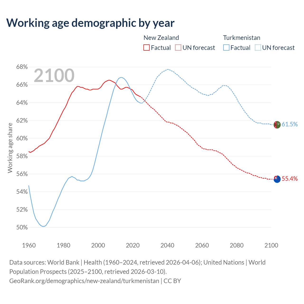 Median age New Zealand vs Turkmenistan, 1960-2100