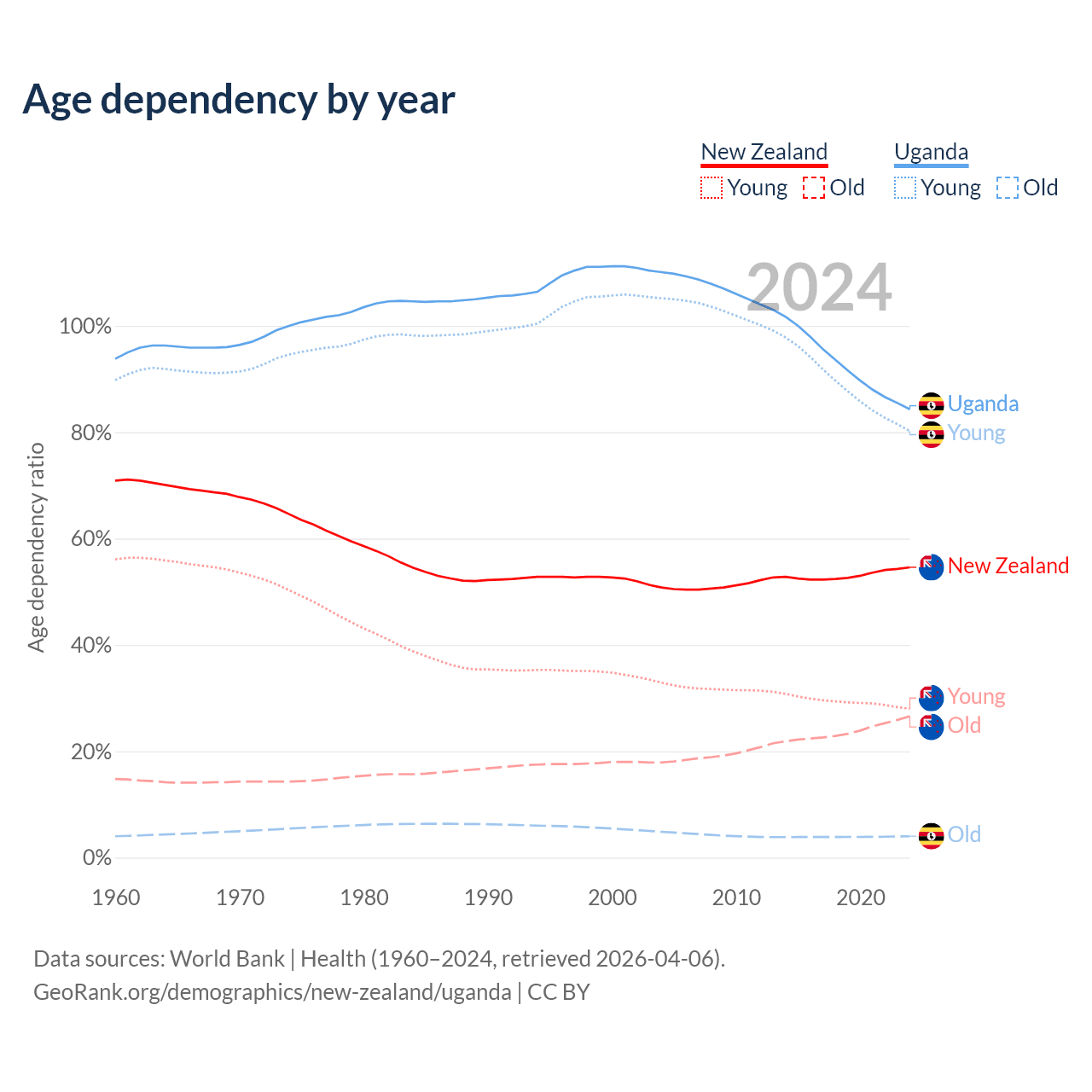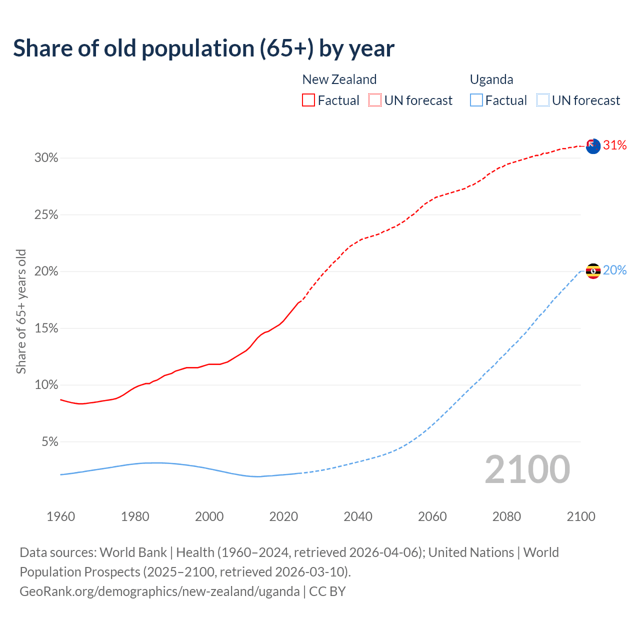 The share of older people aged 65 and over is 17.2% in New Zealand and 2.19% in Uganda. Life expectancy in New Zealand compared to Uganda .
