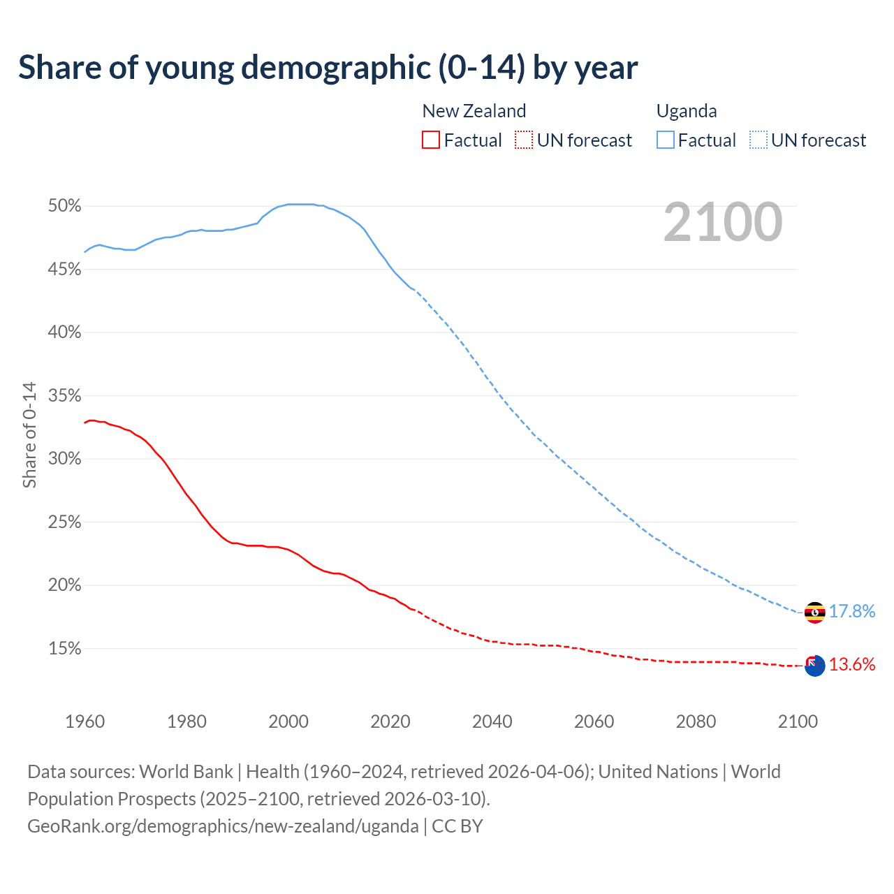 - The share of young demographic (0-15 years old) in New Zealand is 18.1% vs 43.5% in Uganda.