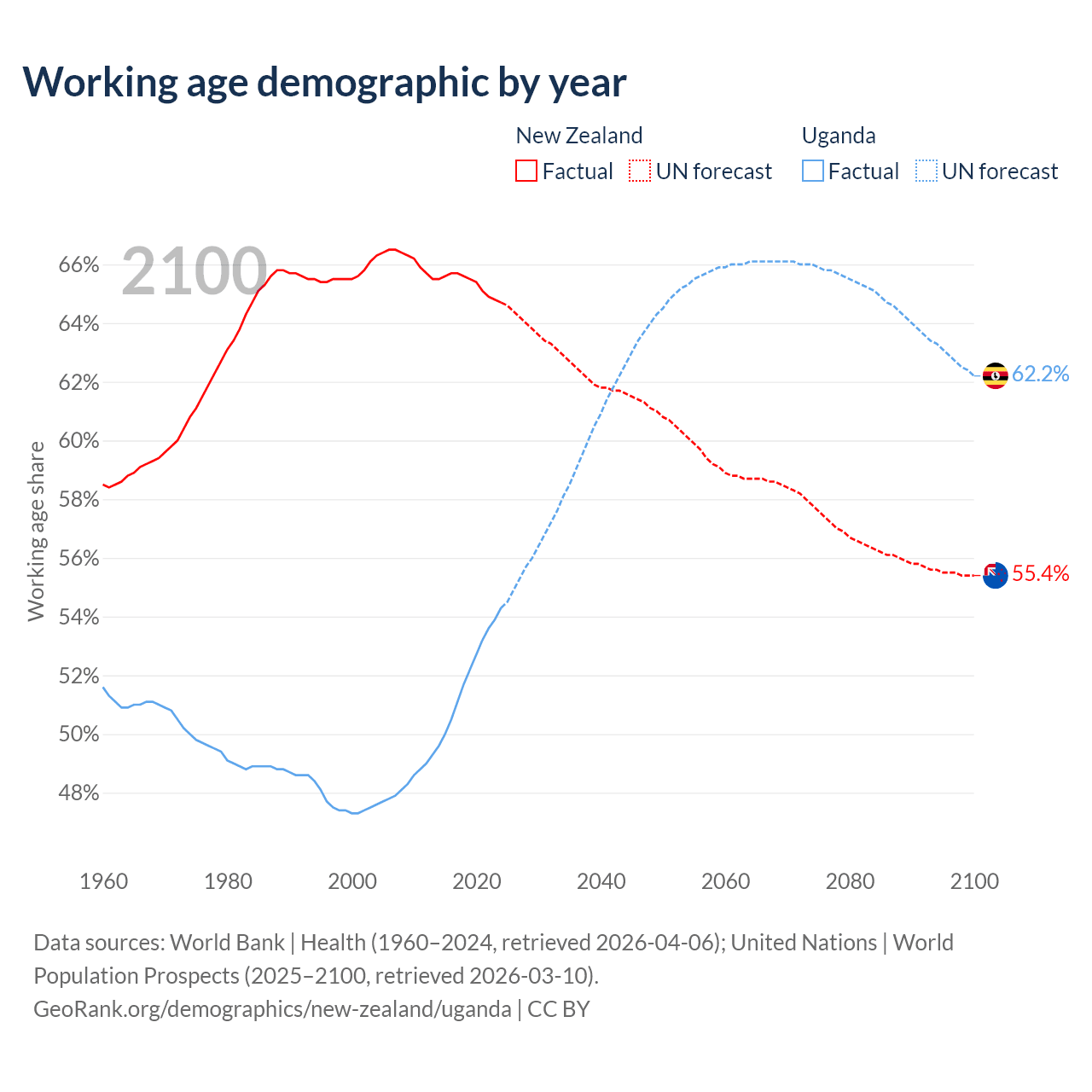 - New Zealand has 3.48M working age adults (aged 15-64) vs 28.9M in Uganda.