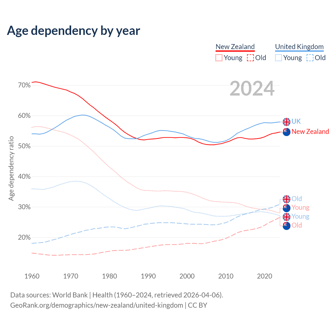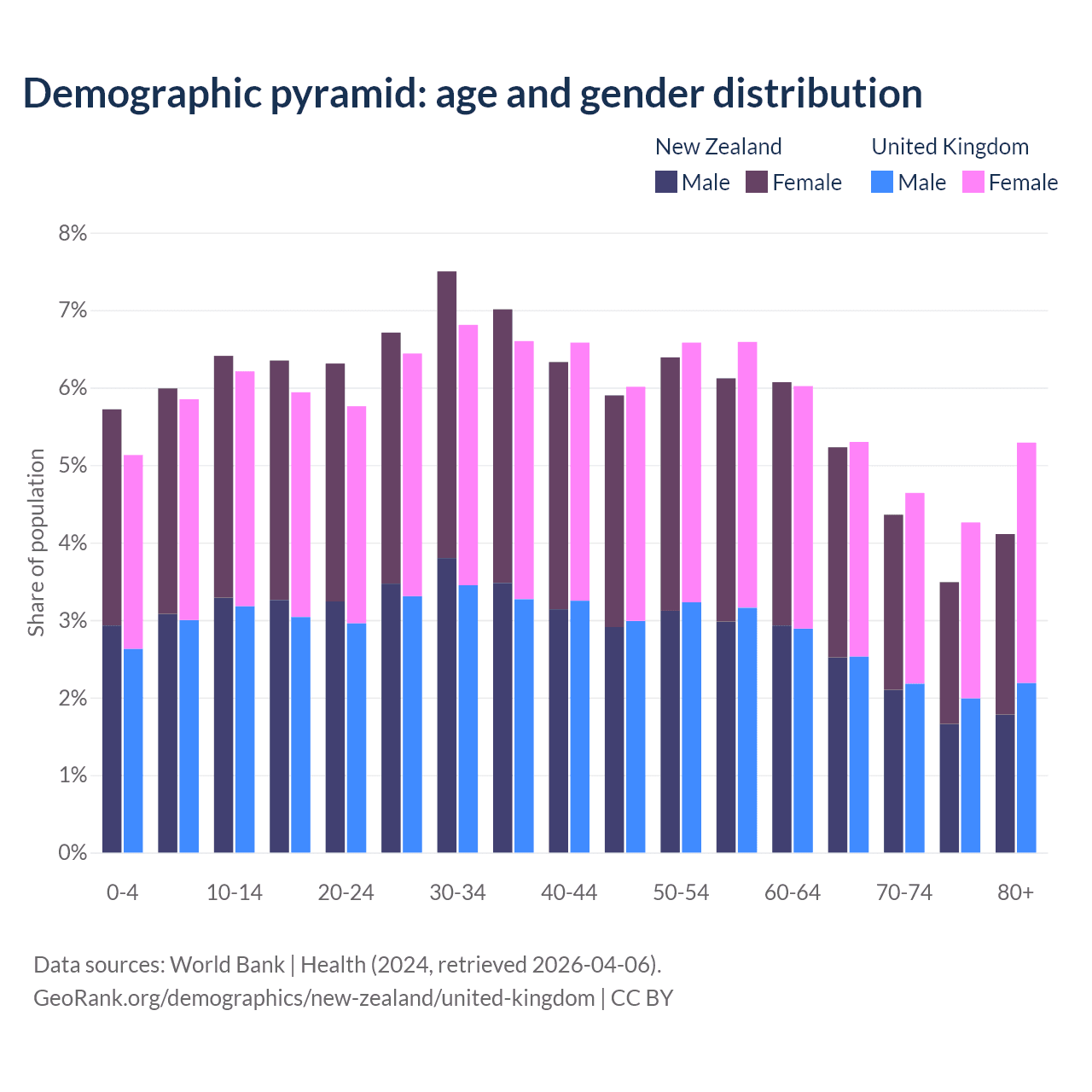 - New Zealand is ranked 56/196 by median age (oldest to youngest) vs 41/196 for the United Kingdom.