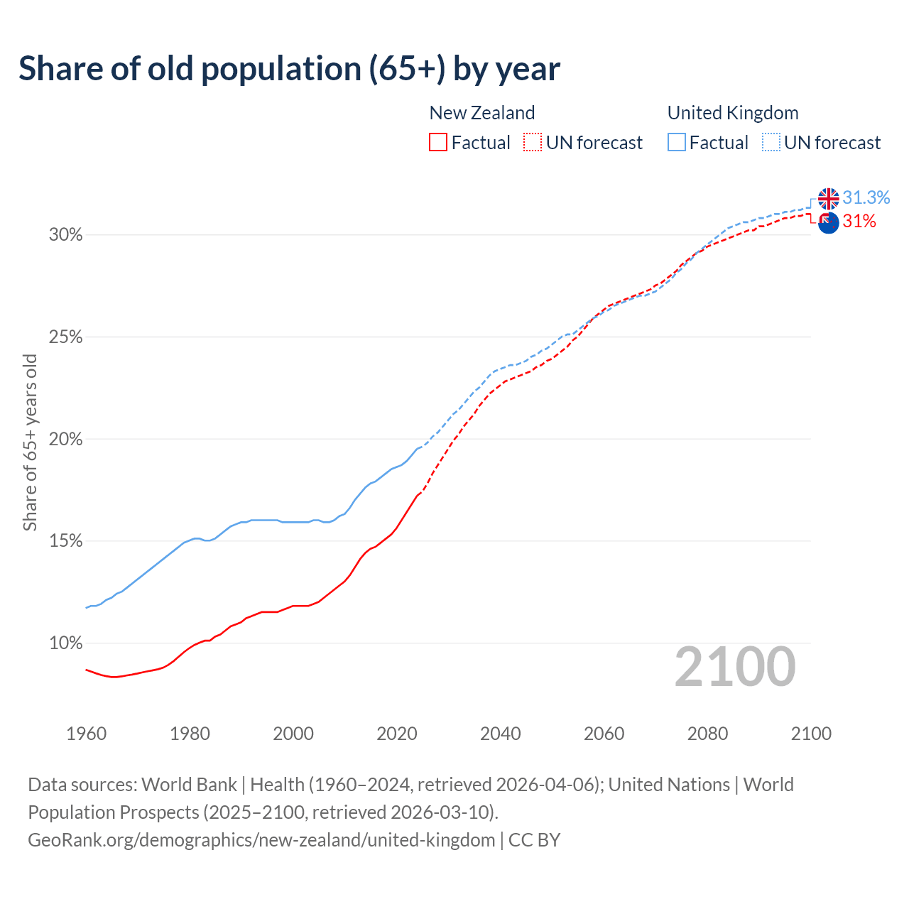 The share of older people aged 65 and over is 17.2% in New Zealand and 19.5% in the United Kingdom. Life expectancy in New Zealand compared to the United Kingdom .