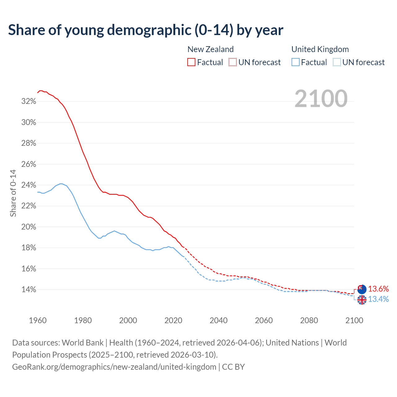- The share of young demographic (0-15 years old) in New Zealand is 18.1% vs 17.2% in the United Kingdom.
