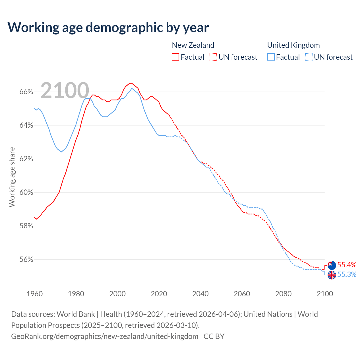 - New Zealand has 3.48M working age adults (aged 15-64) vs 44.4M in the United Kingdom.