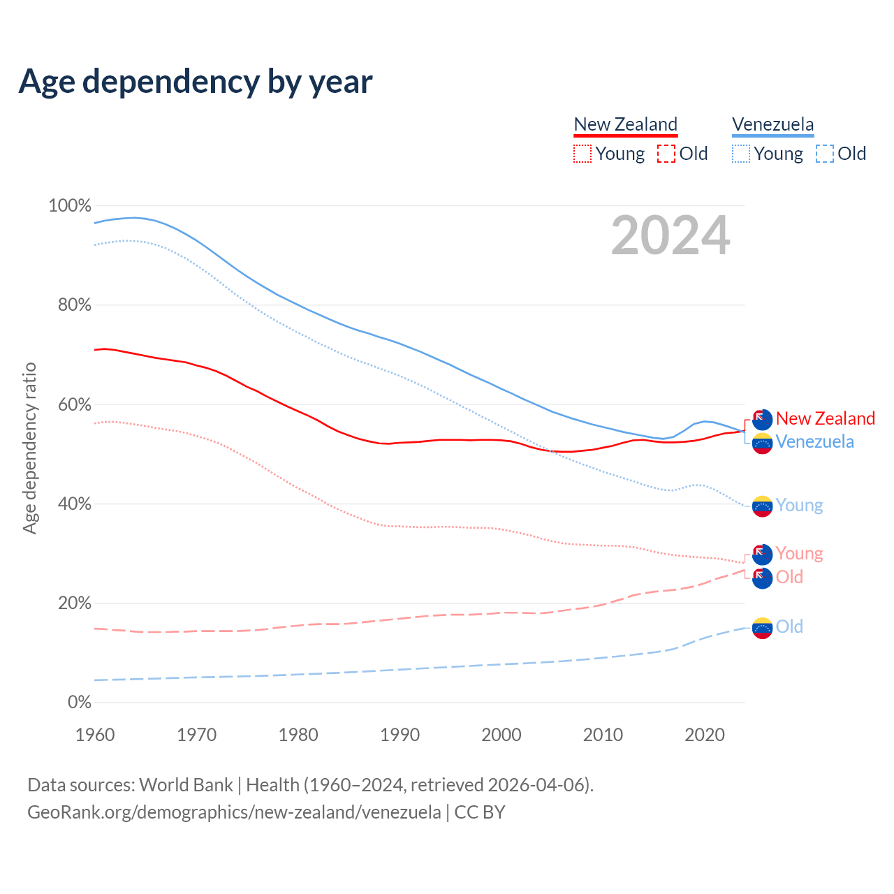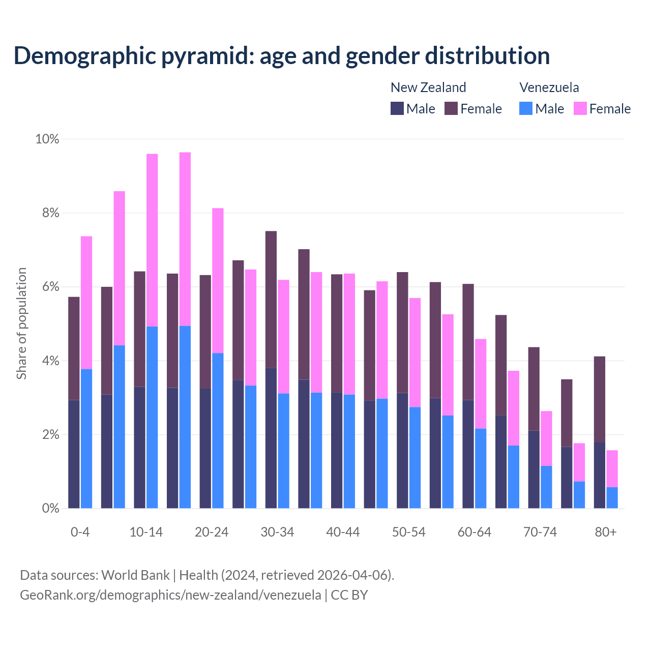 - New Zealand is ranked 56/196 by median age (oldest to youngest) vs 104/196 for Venezuela.