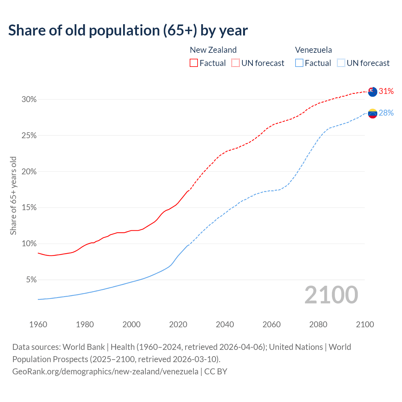 The share of older people aged 65 and over is 17.2% in New Zealand and 9.68% in Venezuela. Life expectancy in New Zealand compared to Venezuela .