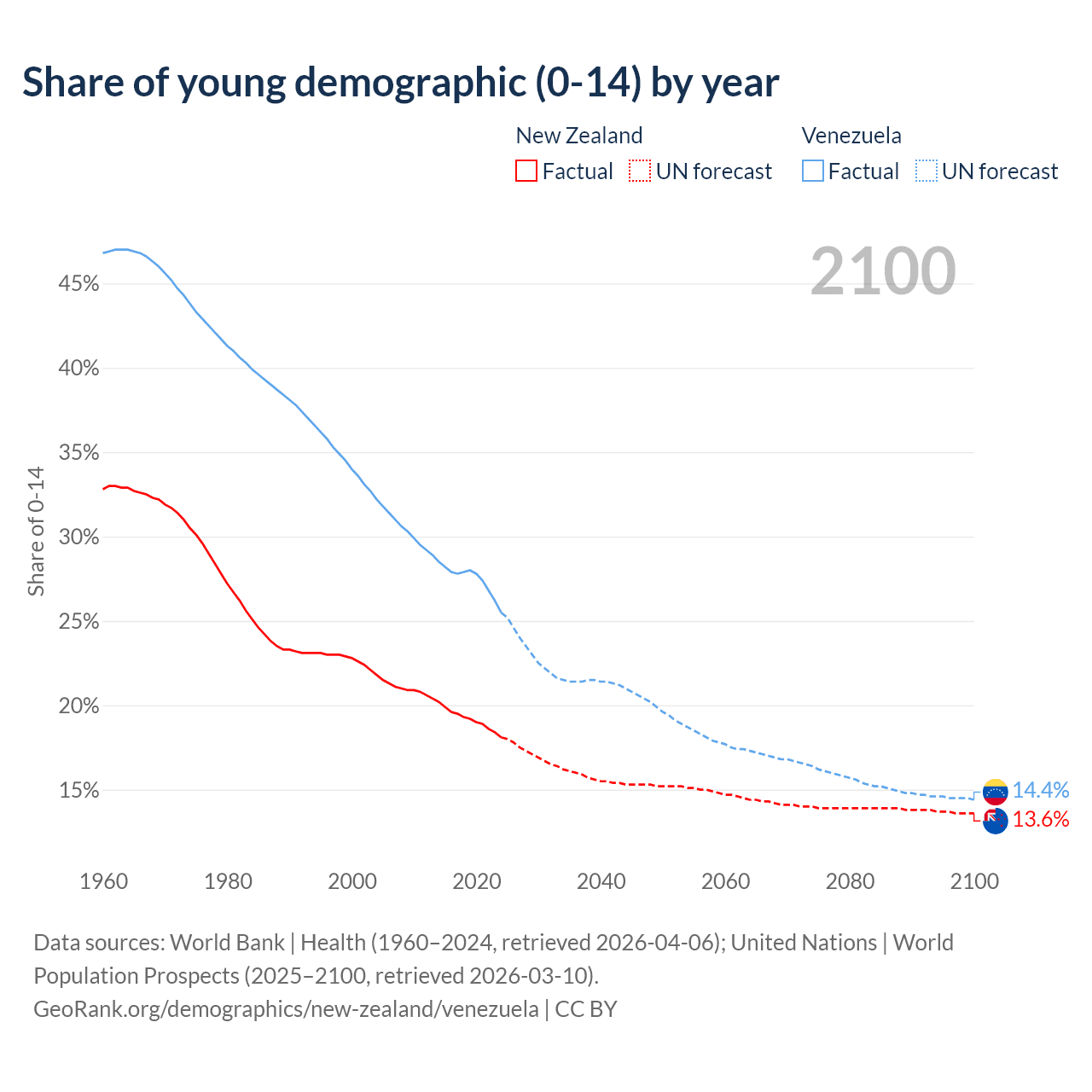 - The share of young demographic (0-15 years old) in New Zealand is 18.1% vs 25.5% in Venezuela.