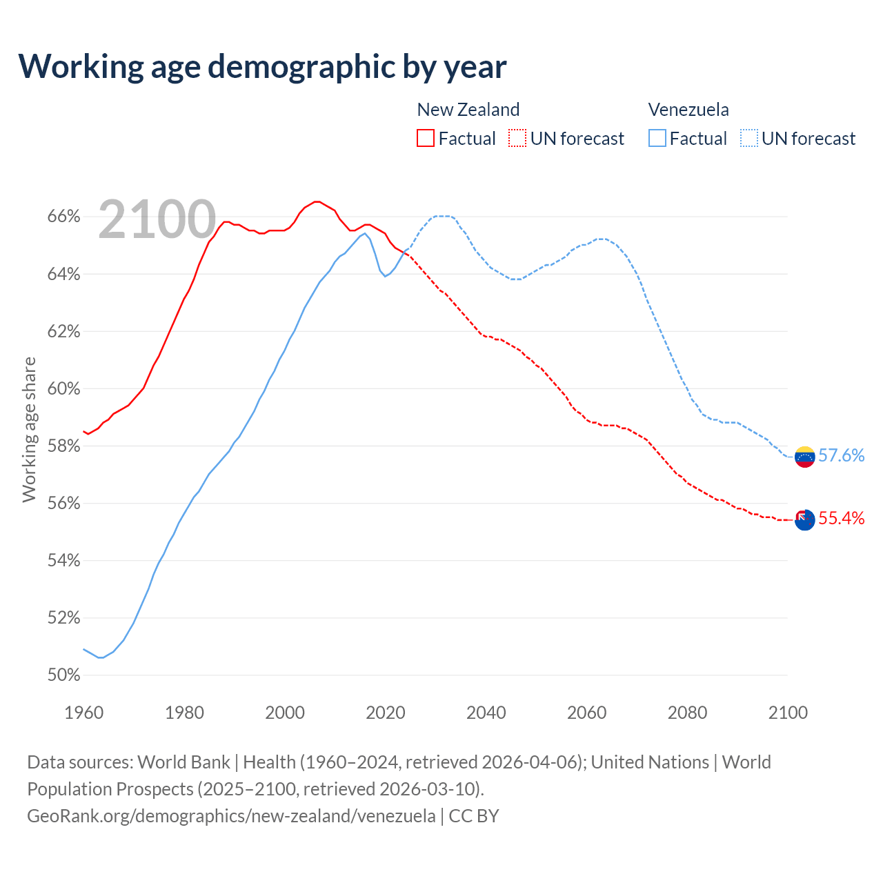 - New Zealand has 3.48M working age adults (aged 15-64) vs 18.6M in Venezuela.