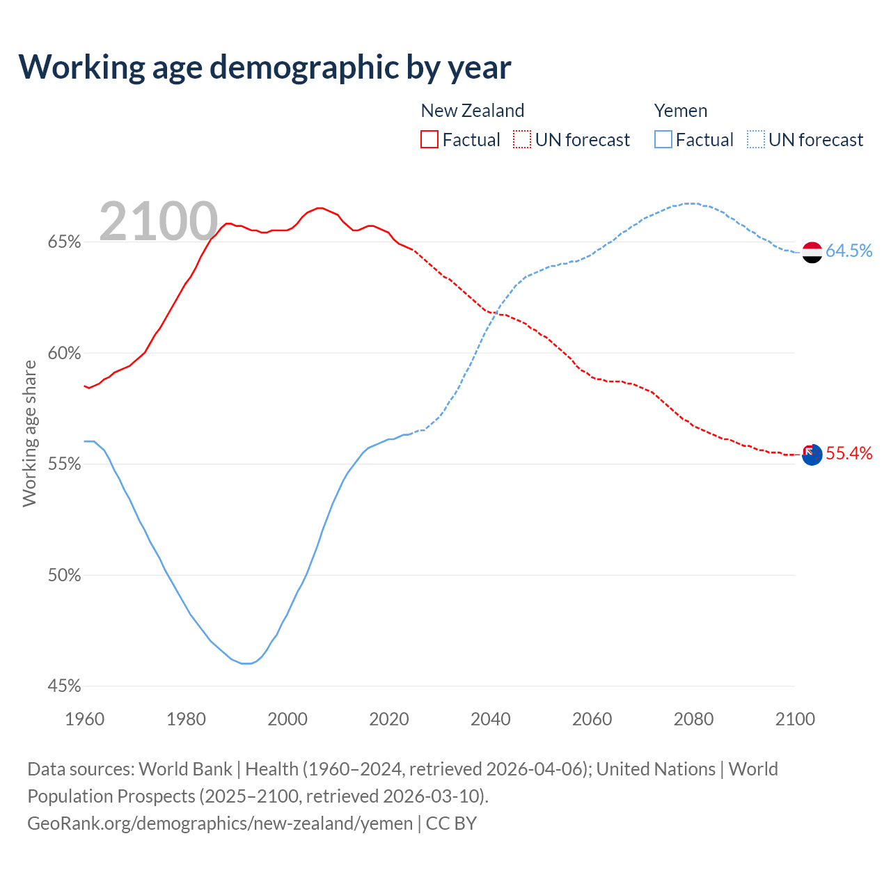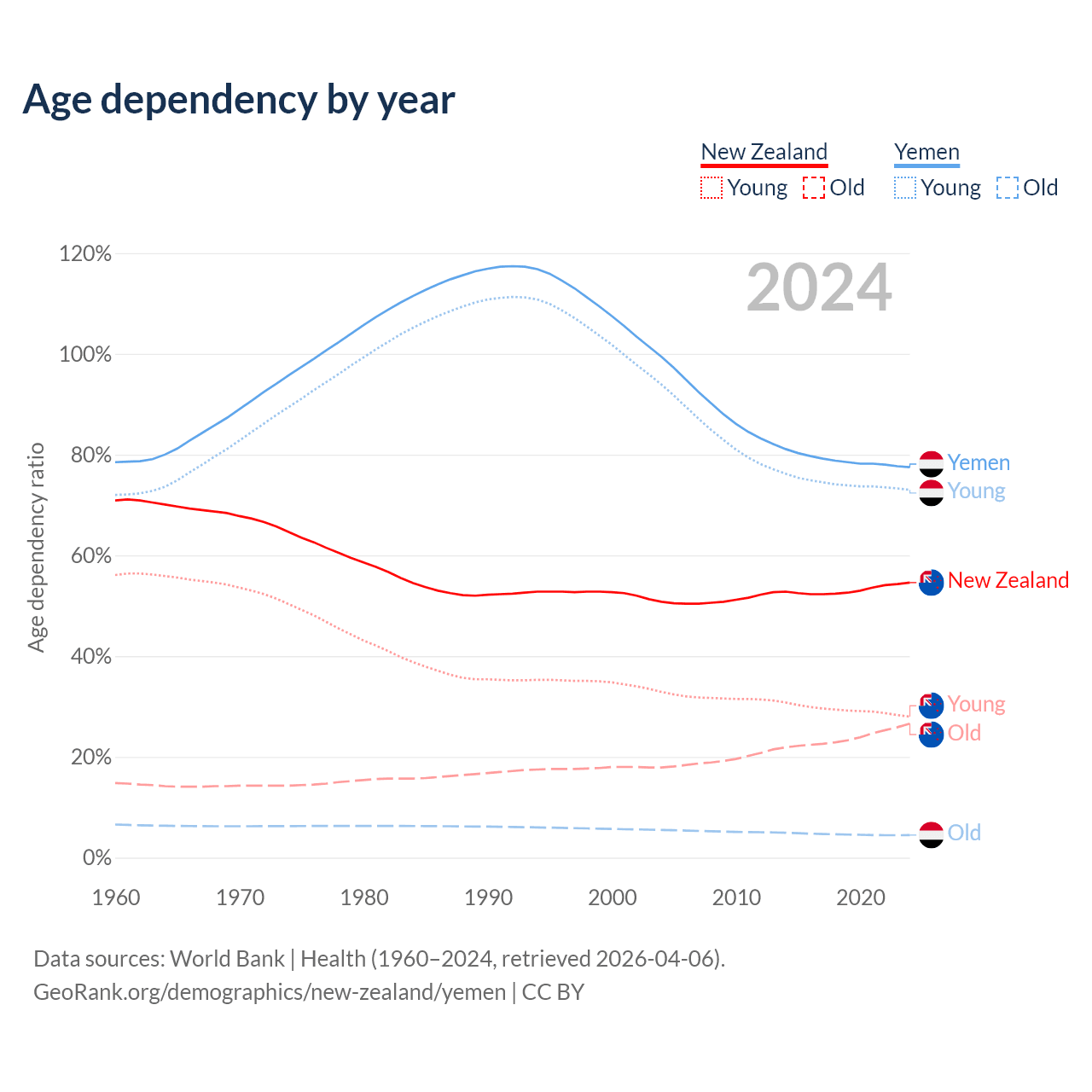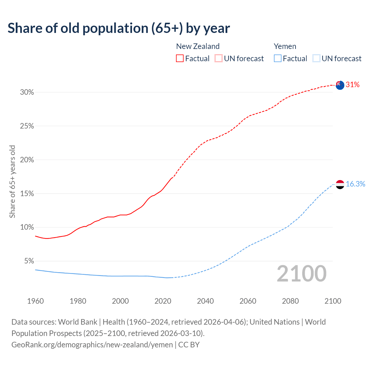 The share of older people aged 65 and over is 17.2% in New Zealand and 2.52% in Yemen. Life expectancy in New Zealand compared to Yemen .