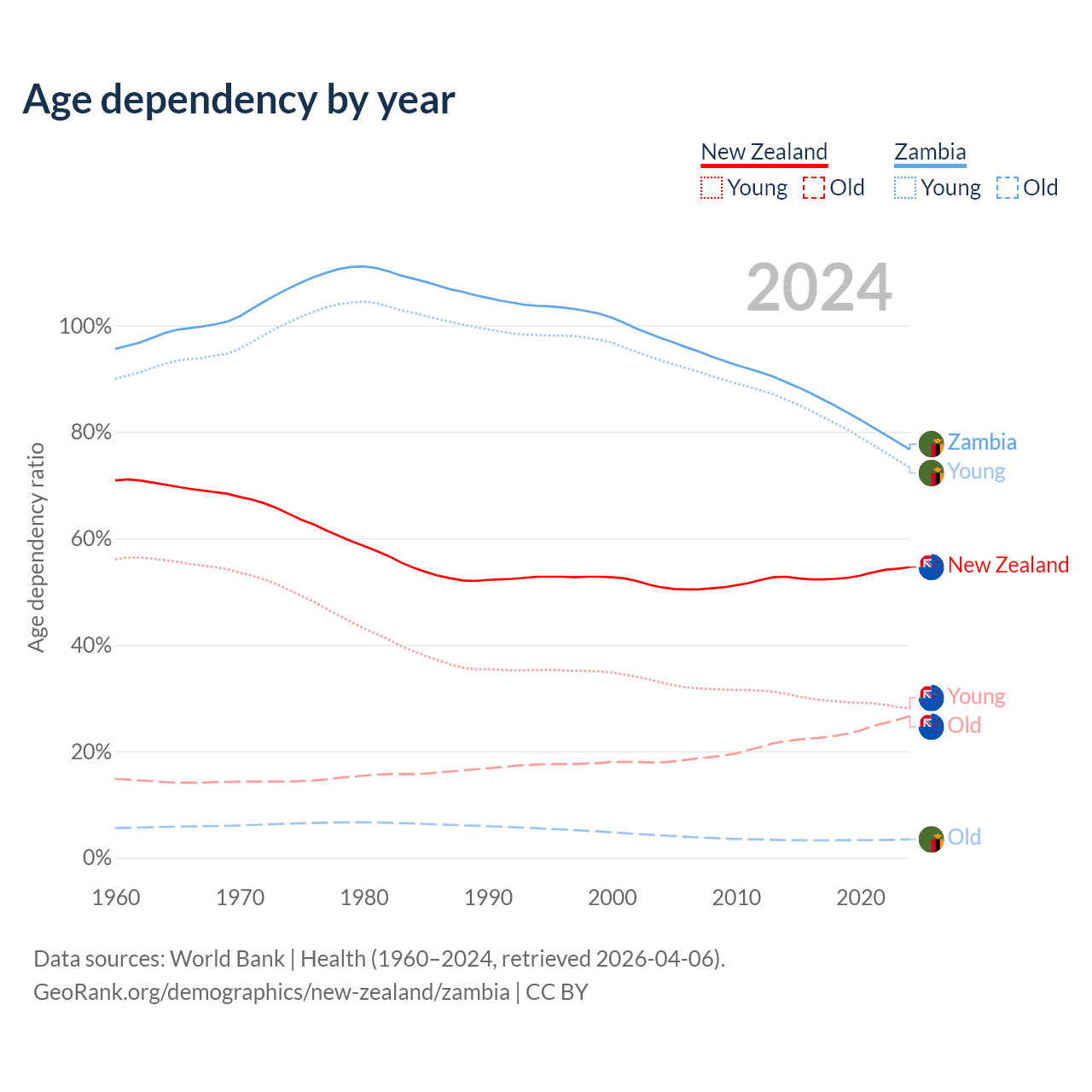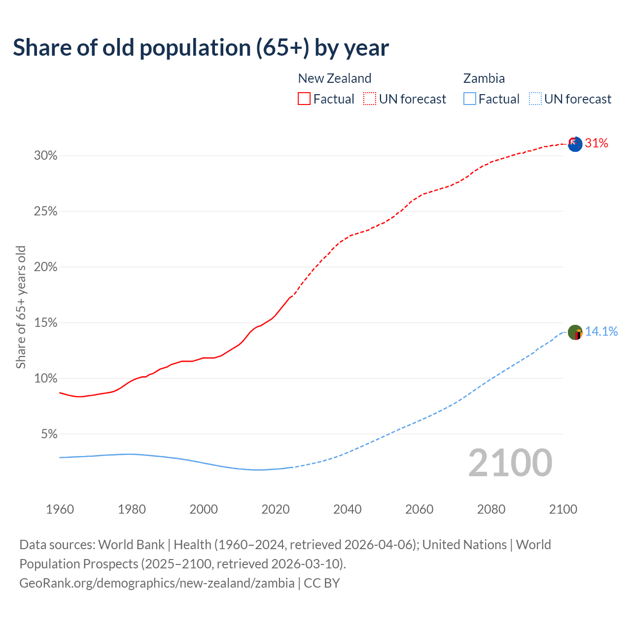 The share of older people aged 65 and over is 17.2% in New Zealand and 1.95% in Zambia. Life expectancy in New Zealand compared to Zambia .