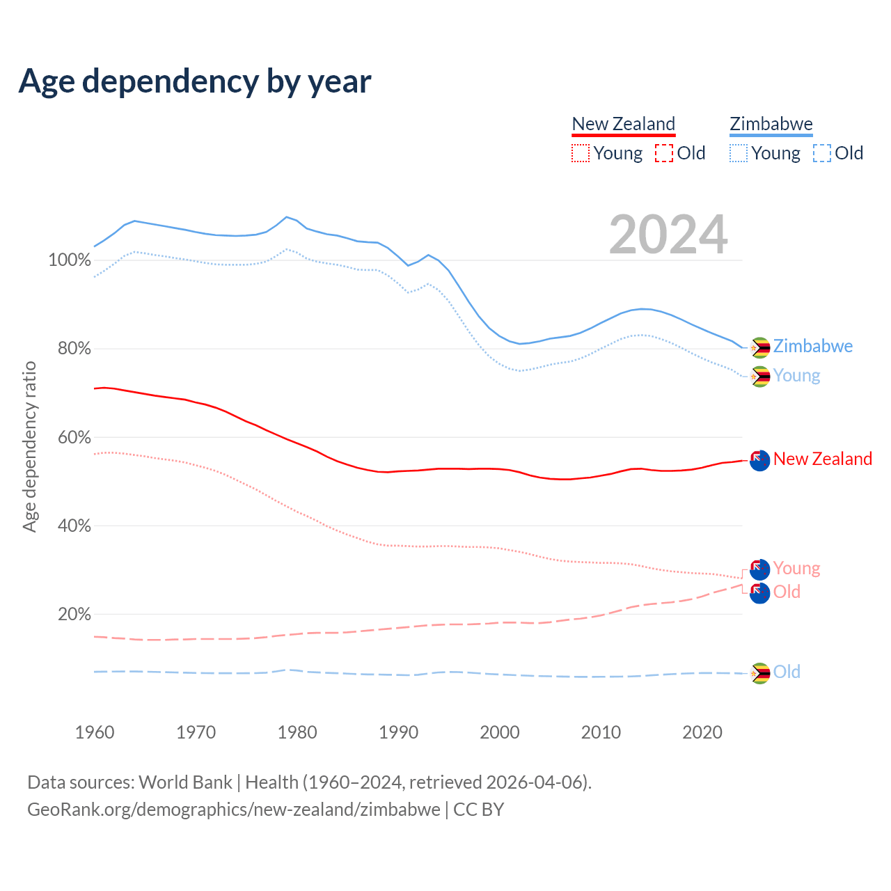 - New Zealand is ranked 56/196 by median age (oldest to youngest) vs 177/196 for Zimbabwe.
