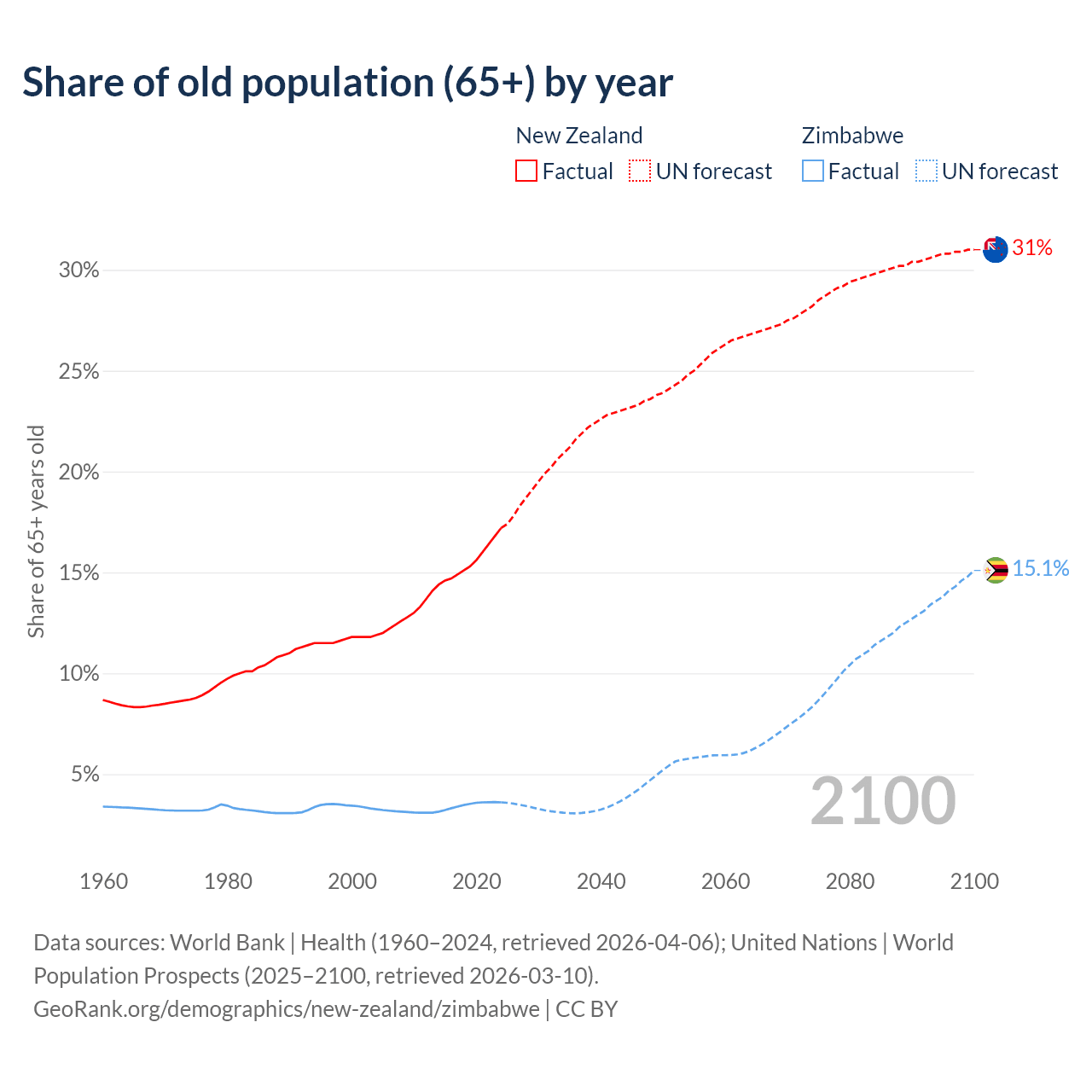 The share of older people aged 65 and over is 17.2% in New Zealand and 3.6% in Zimbabwe. Life expectancy in New Zealand compared to Zimbabwe .