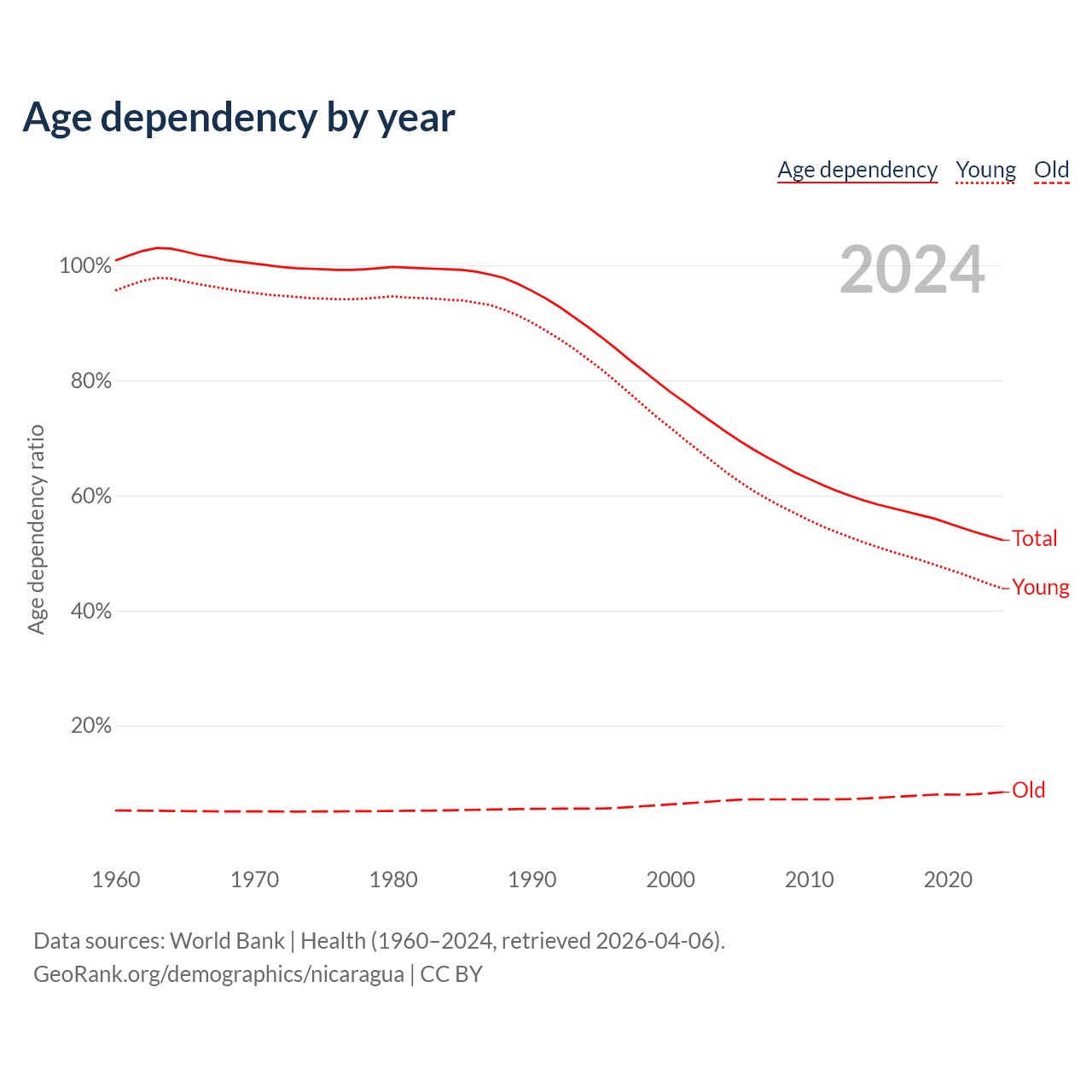 Data sources: World Bank | Health (1960–2024, retrieved 2026-04-06); U.S. Census Bureau (1960–2024, retrieved 2026-02-08).