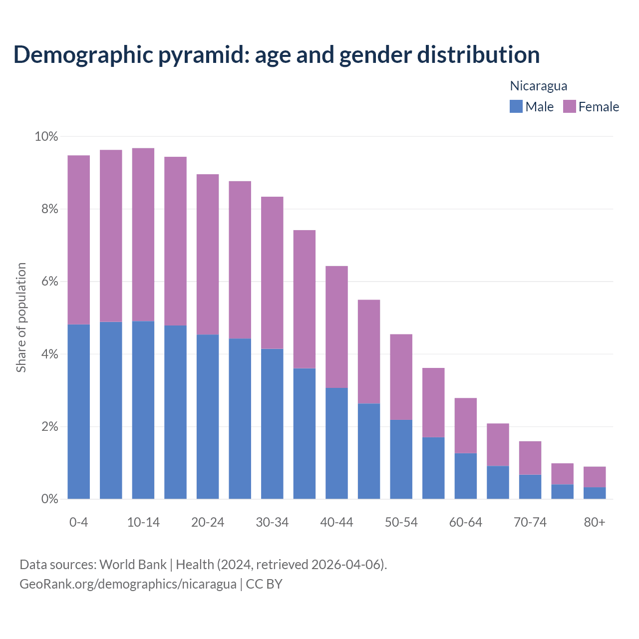 With a population of 6.92M people, Nicaragua has a median age of 26.6 years which makes it the 125/196 oldest country. 28.8% of the demographic are children 0-14 years old, 65.7% are working-age people aged 15-64, and 5.53% are older population aged 65+ years.