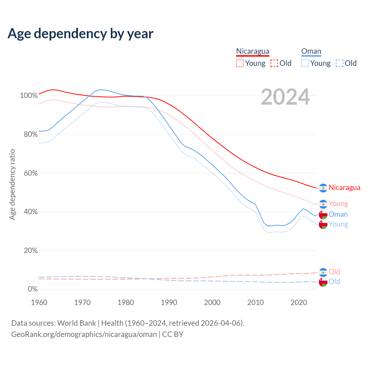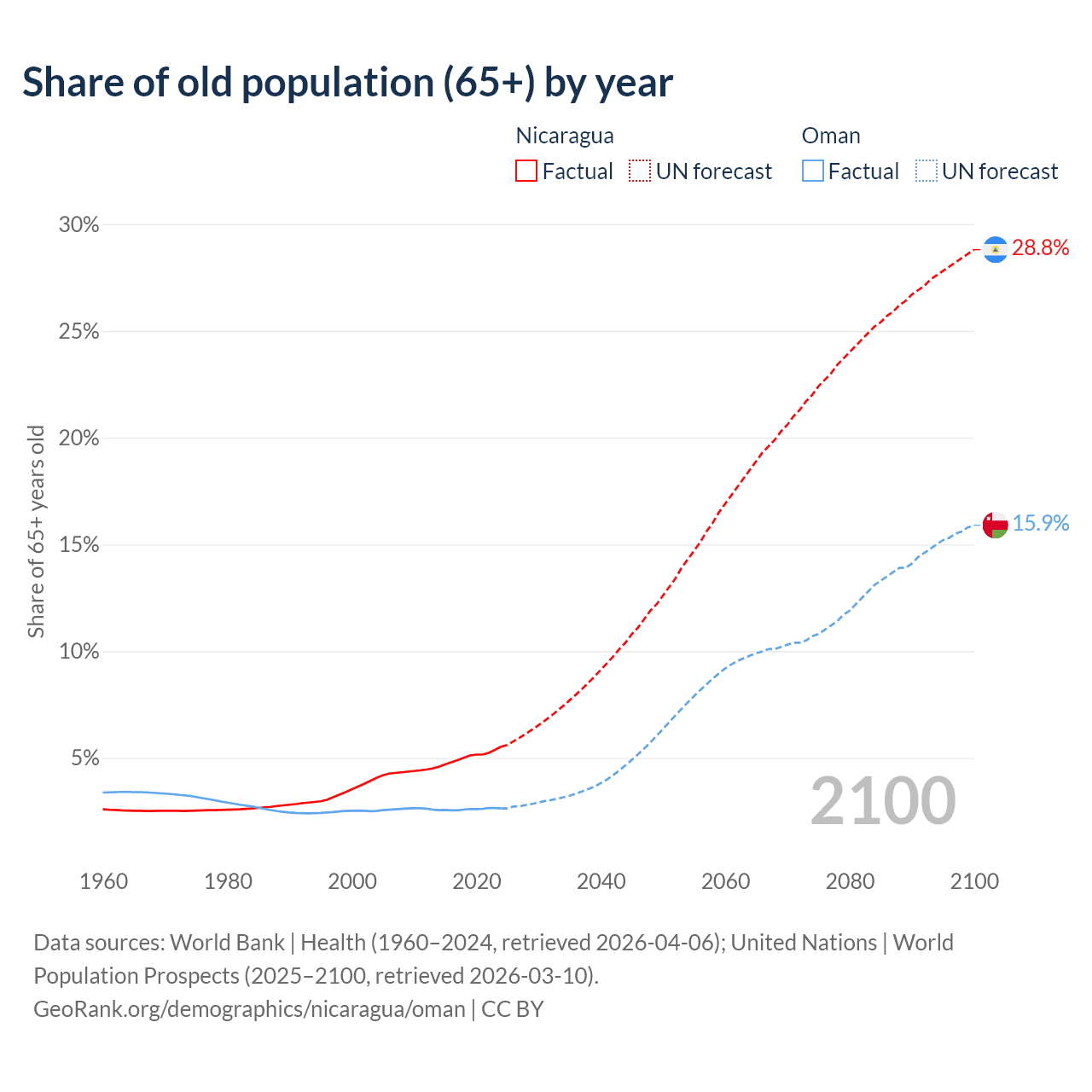 - The share of old-age demographic (65+) in Nicaragua is 5.53% vs 2.64% in Oman.