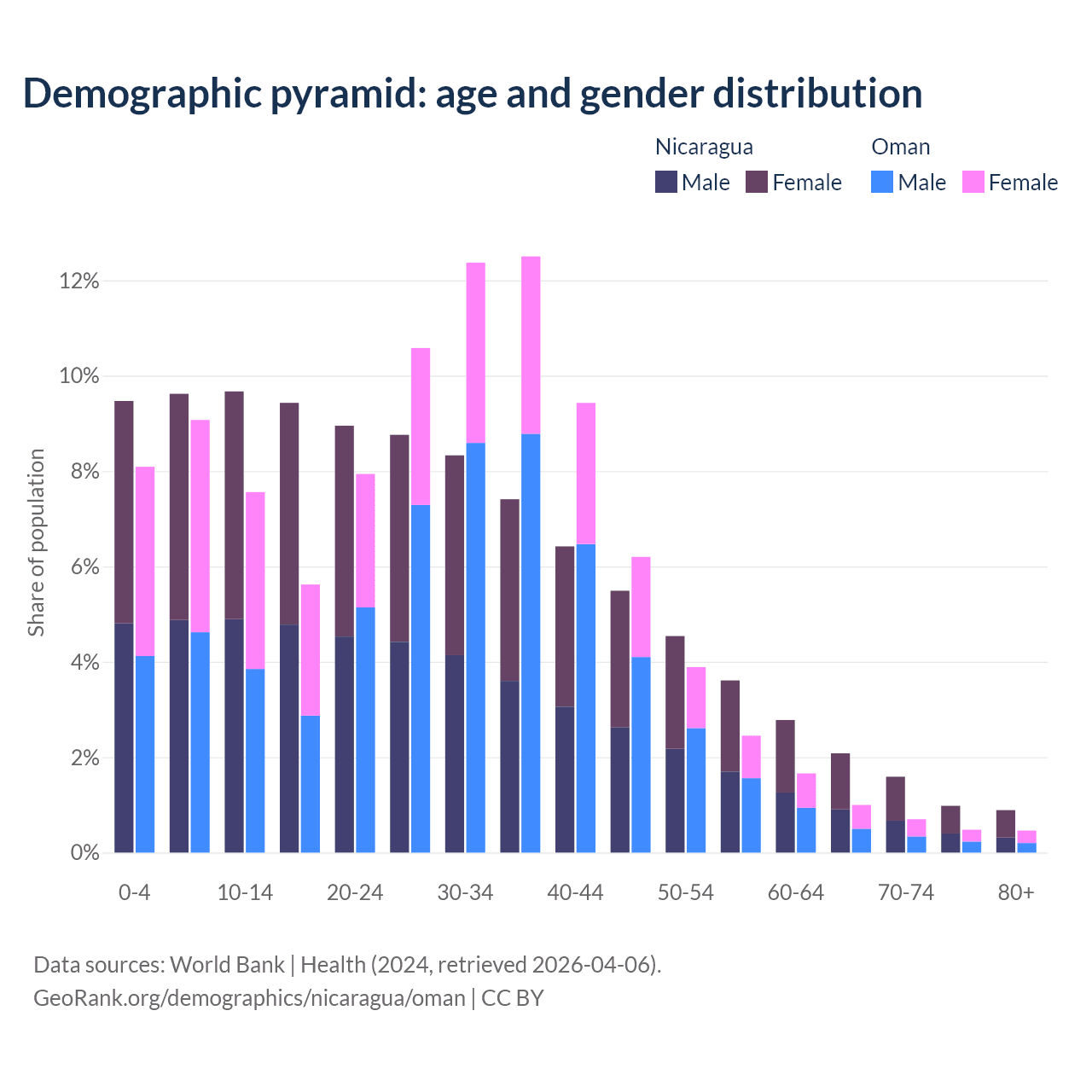 - The median age in Nicaragua is 26.6 years compared to 30.5 years in Oman.