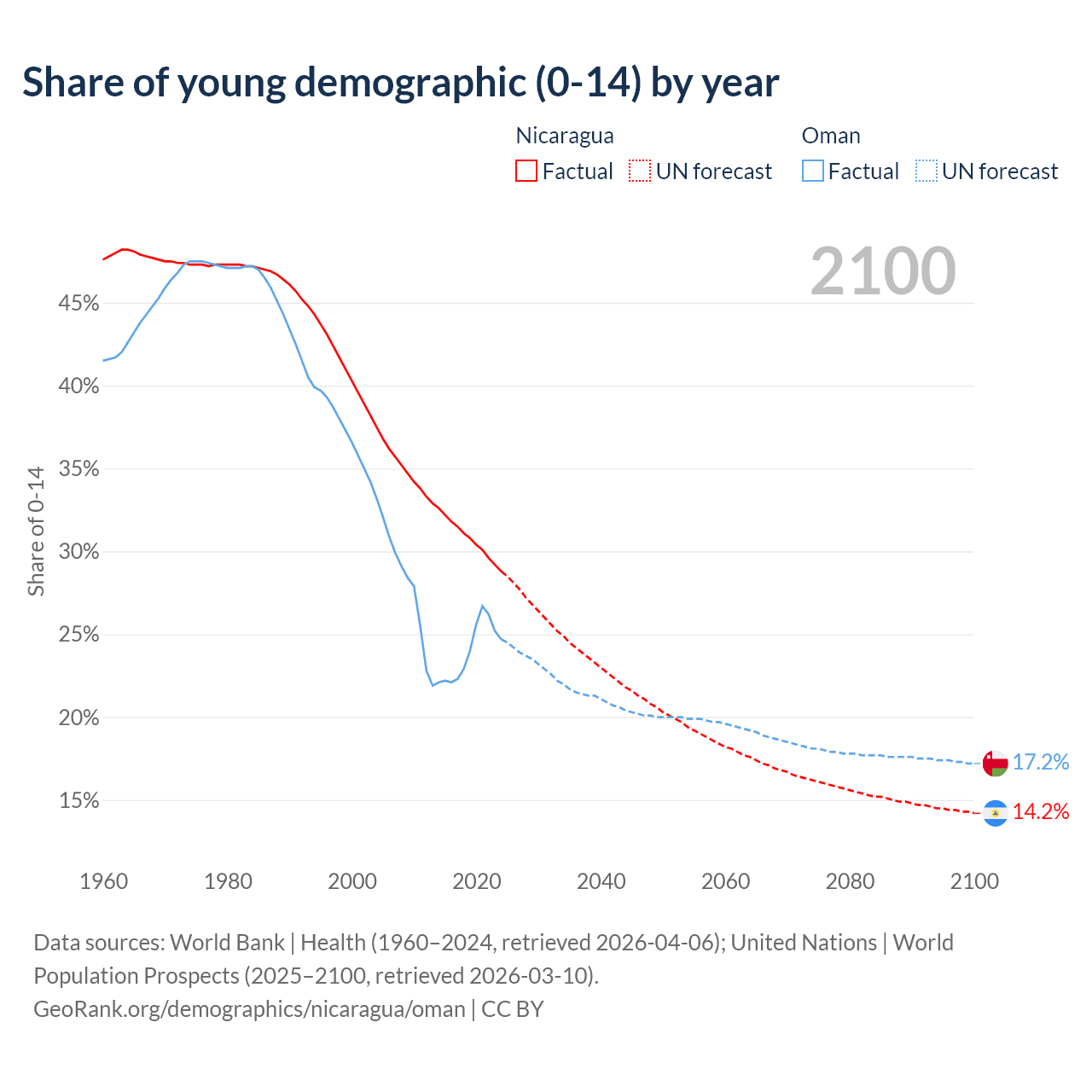 - The share of young demographic (0-15 years old) in Nicaragua is 28.8% vs 24.7% in Oman.