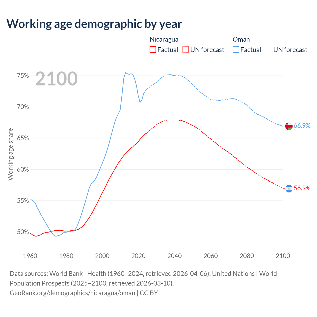 - Nicaragua has 4.68M working age adults (aged 15-64) vs 4.19M in Oman.