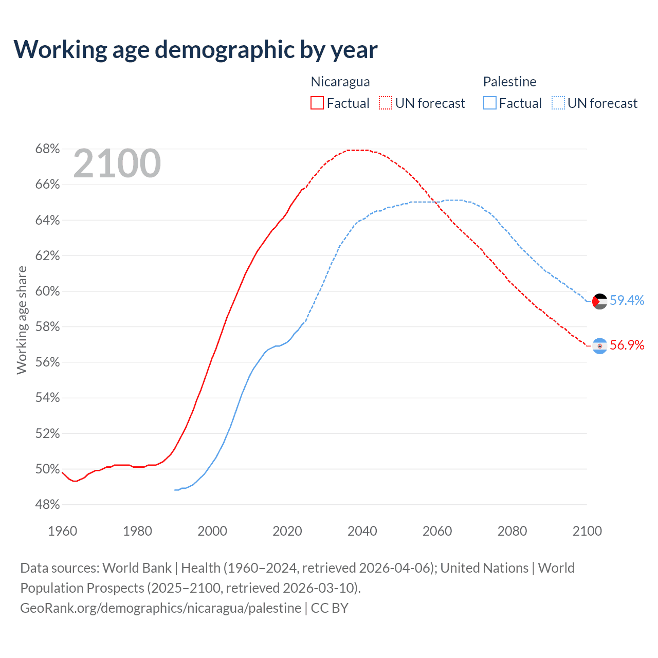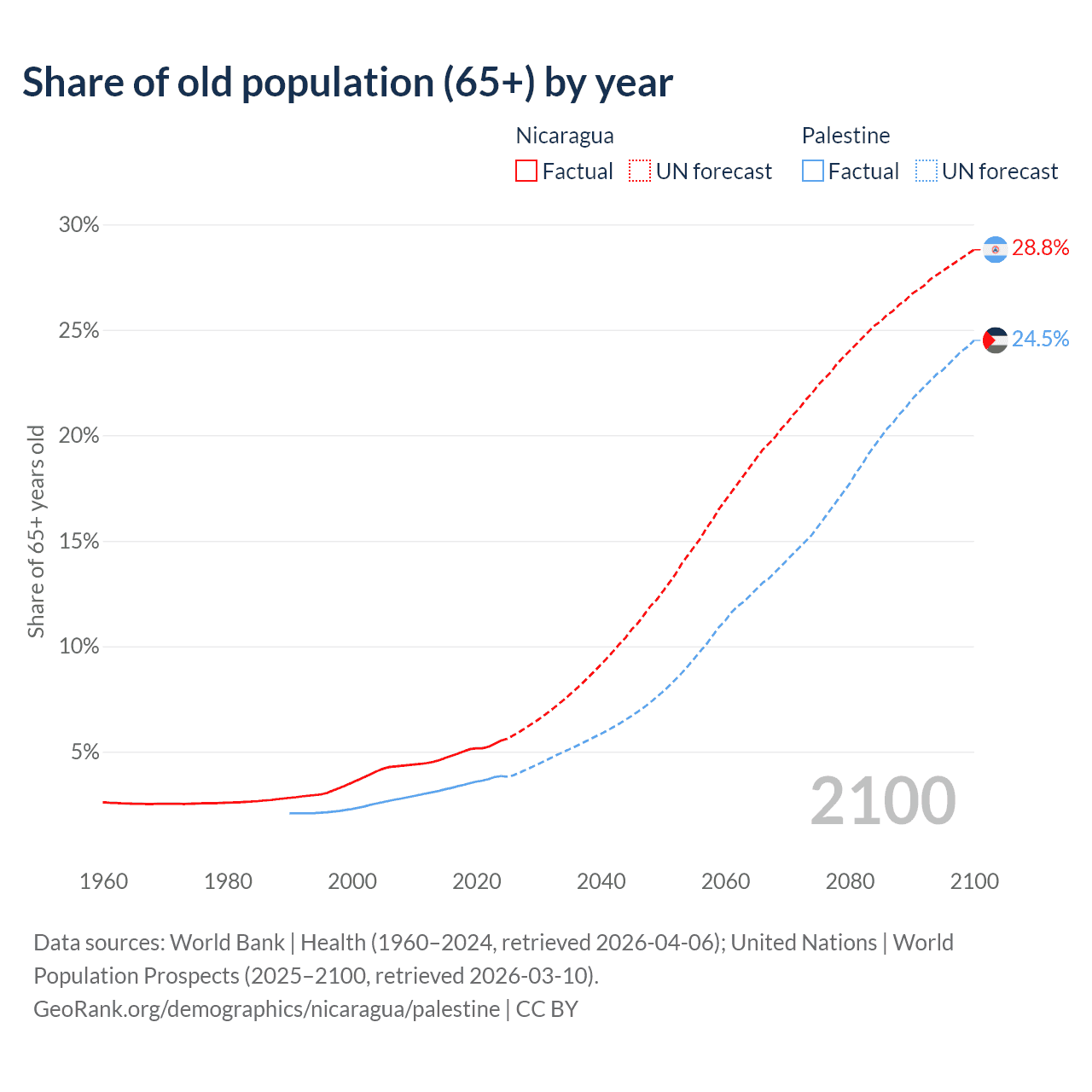 - The share of old-age demographic (65+) in Nicaragua is 5.53% vs 3.84% in Palestine.