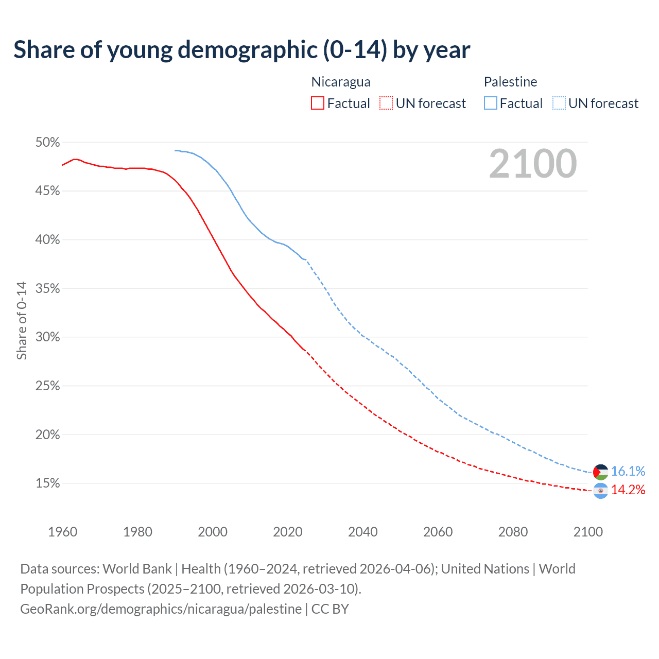 Median age Nicaragua vs Palestine, 1960-2100