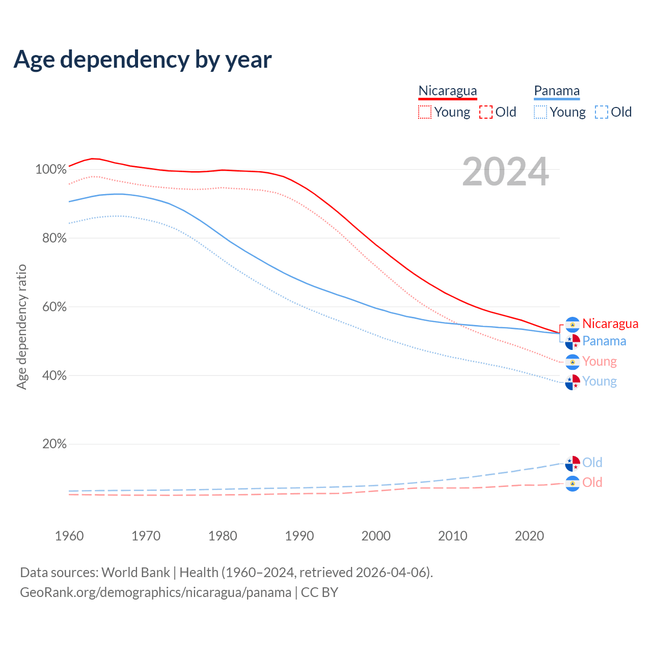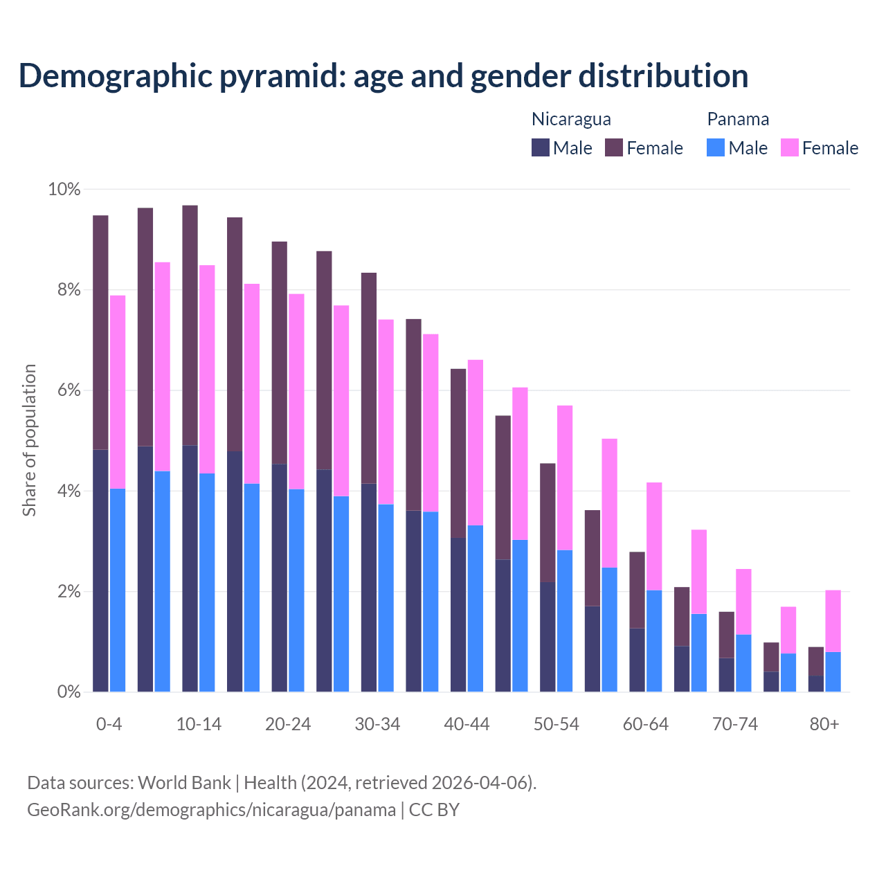 - Nicaragua is ranked 125/196 by median age (oldest to youngest) vs 94/196 for Panama.