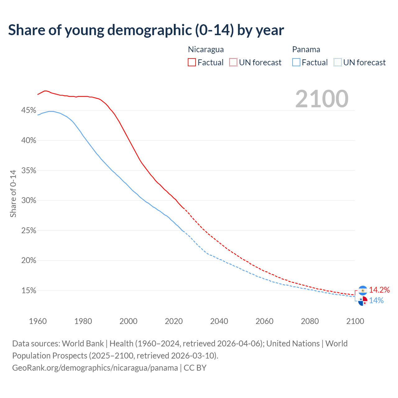 - The share of young demographic (0-15 years old) in Nicaragua is 28.8% vs 24.9% in Panama.