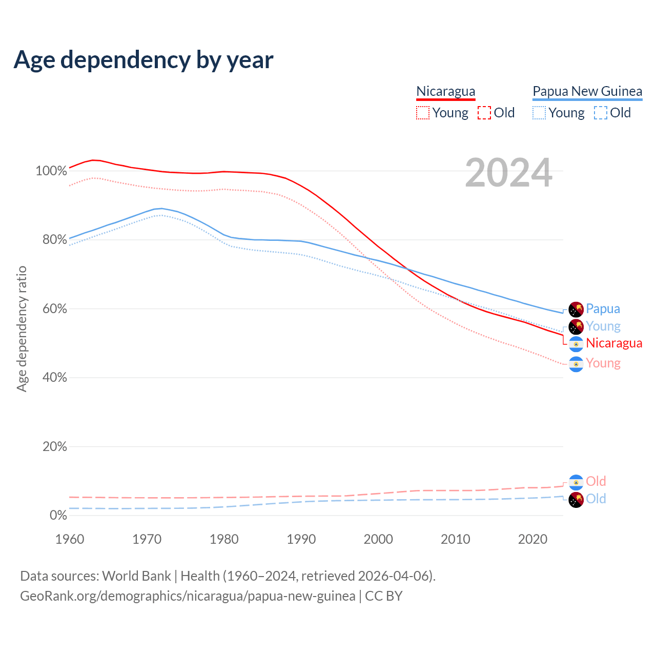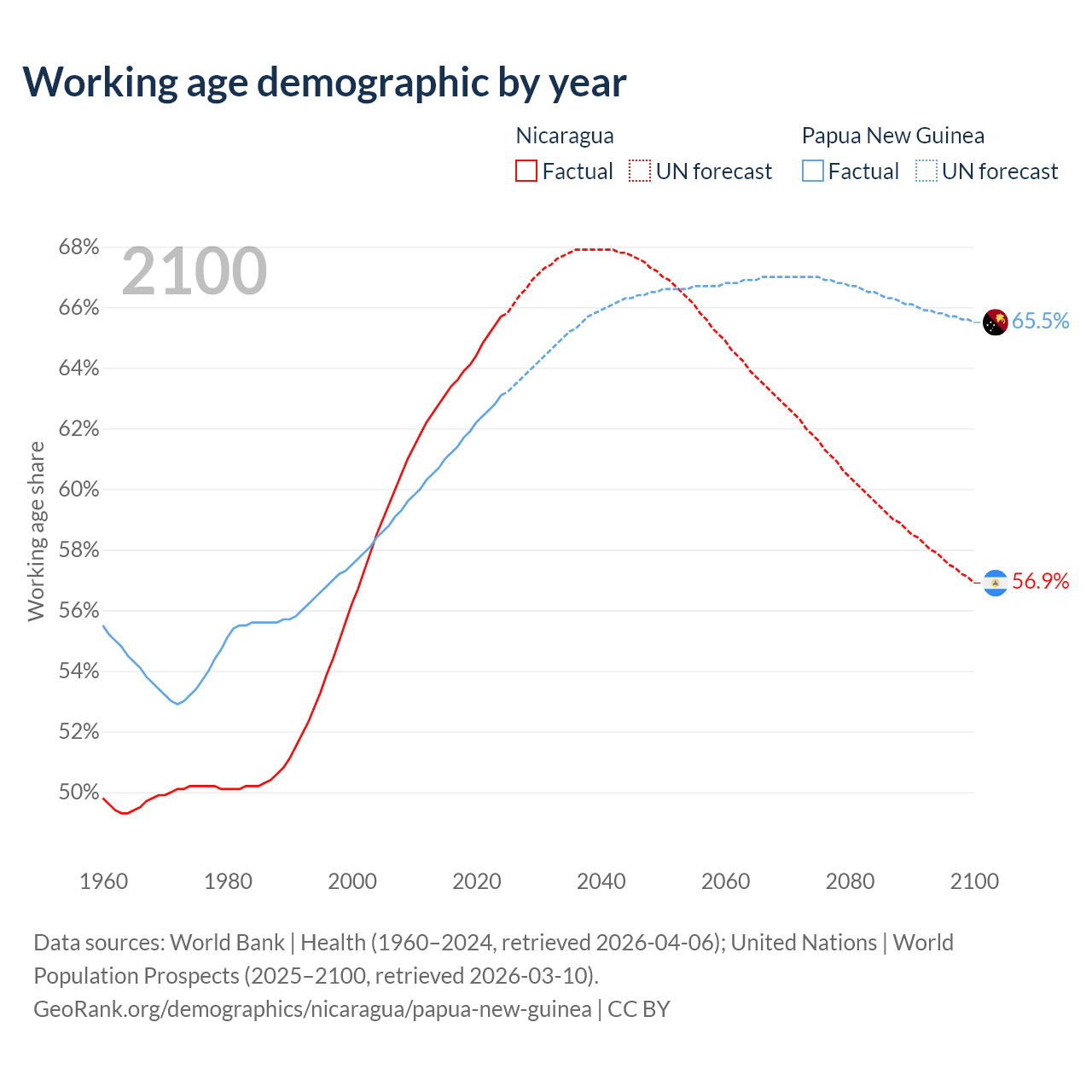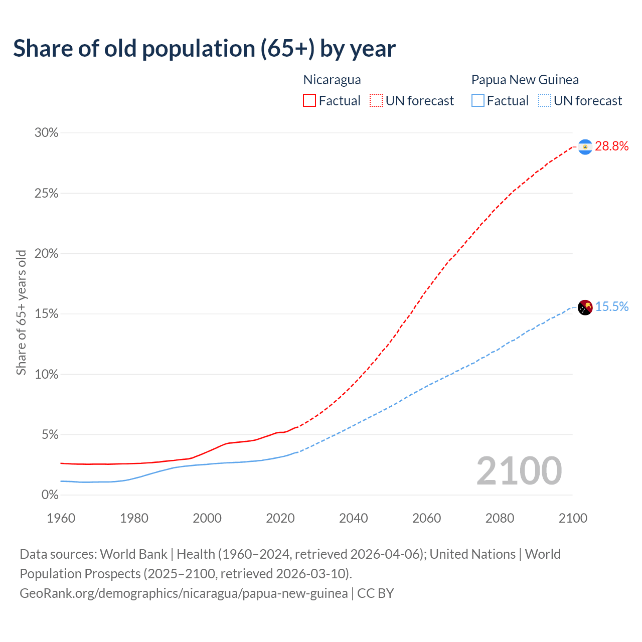 - The share of old-age demographic (65+) in Nicaragua is 5.53% vs 3.46% in Papua New Guinea.