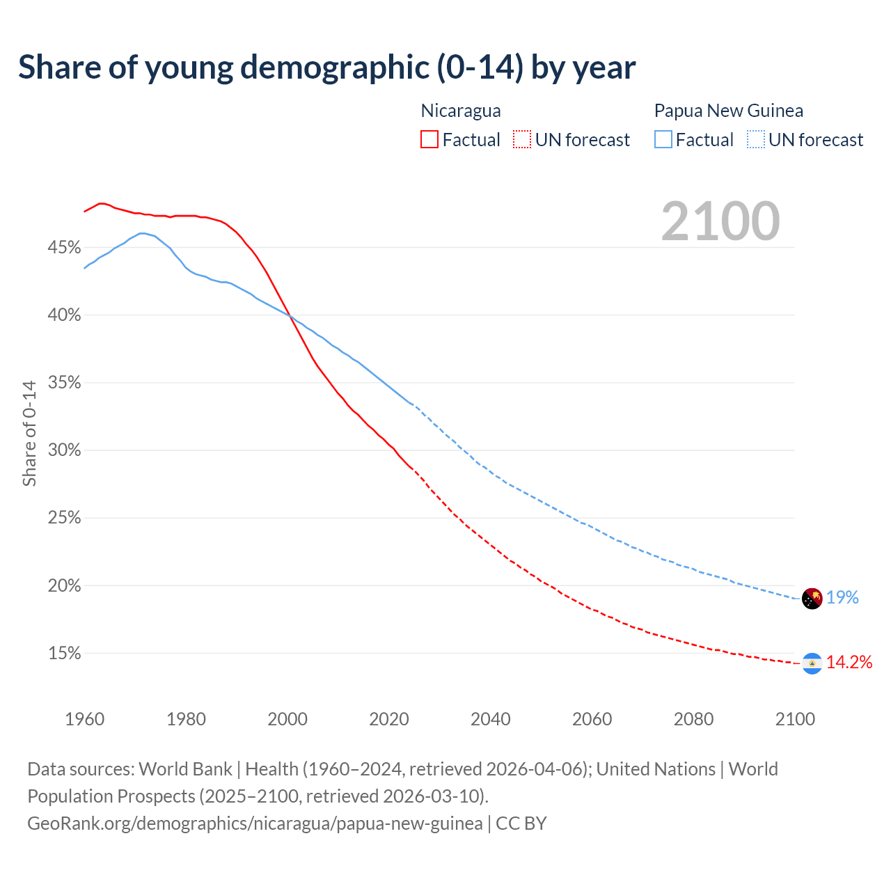 - The share of young demographic (0-15 years old) in Nicaragua is 28.8% vs 33.5% in Papua New Guinea.