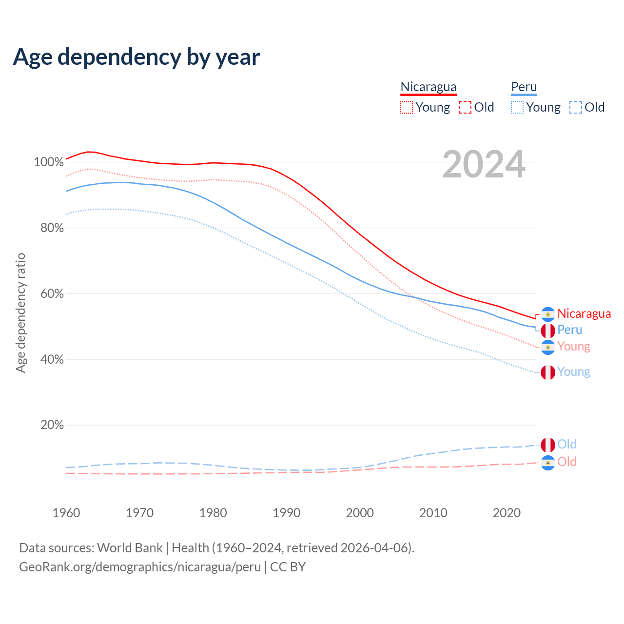 - Nicaragua is ranked 125/196 by median age (oldest to youngest) vs 97/196 for Peru.