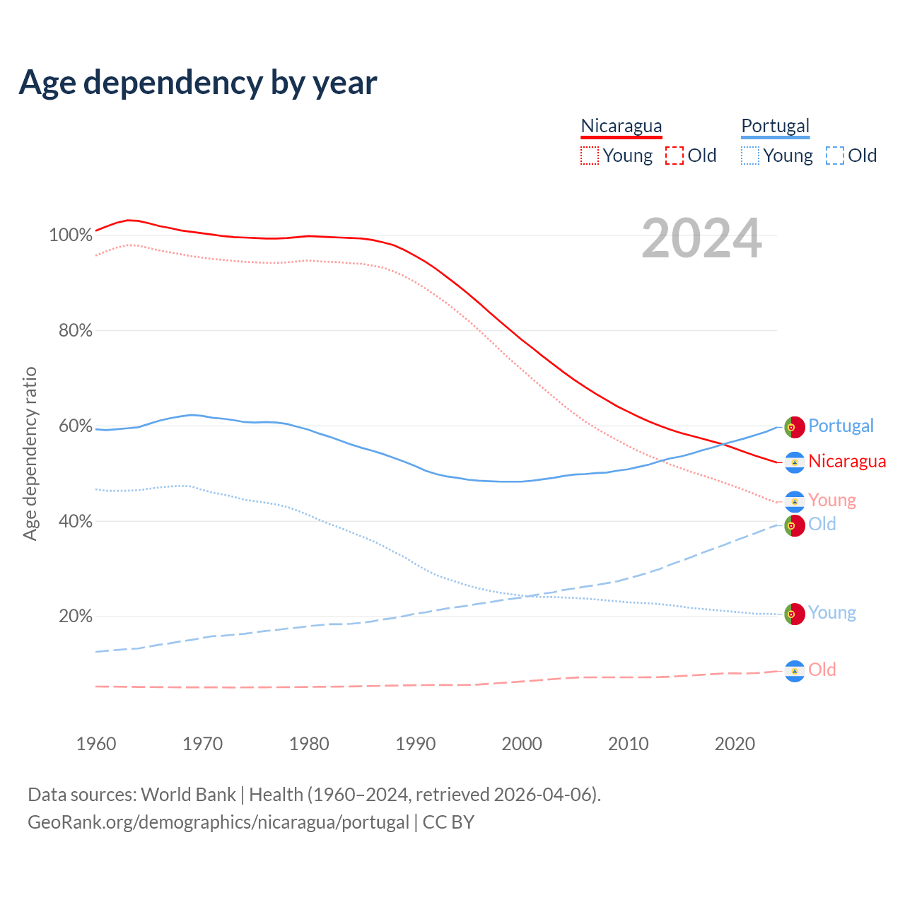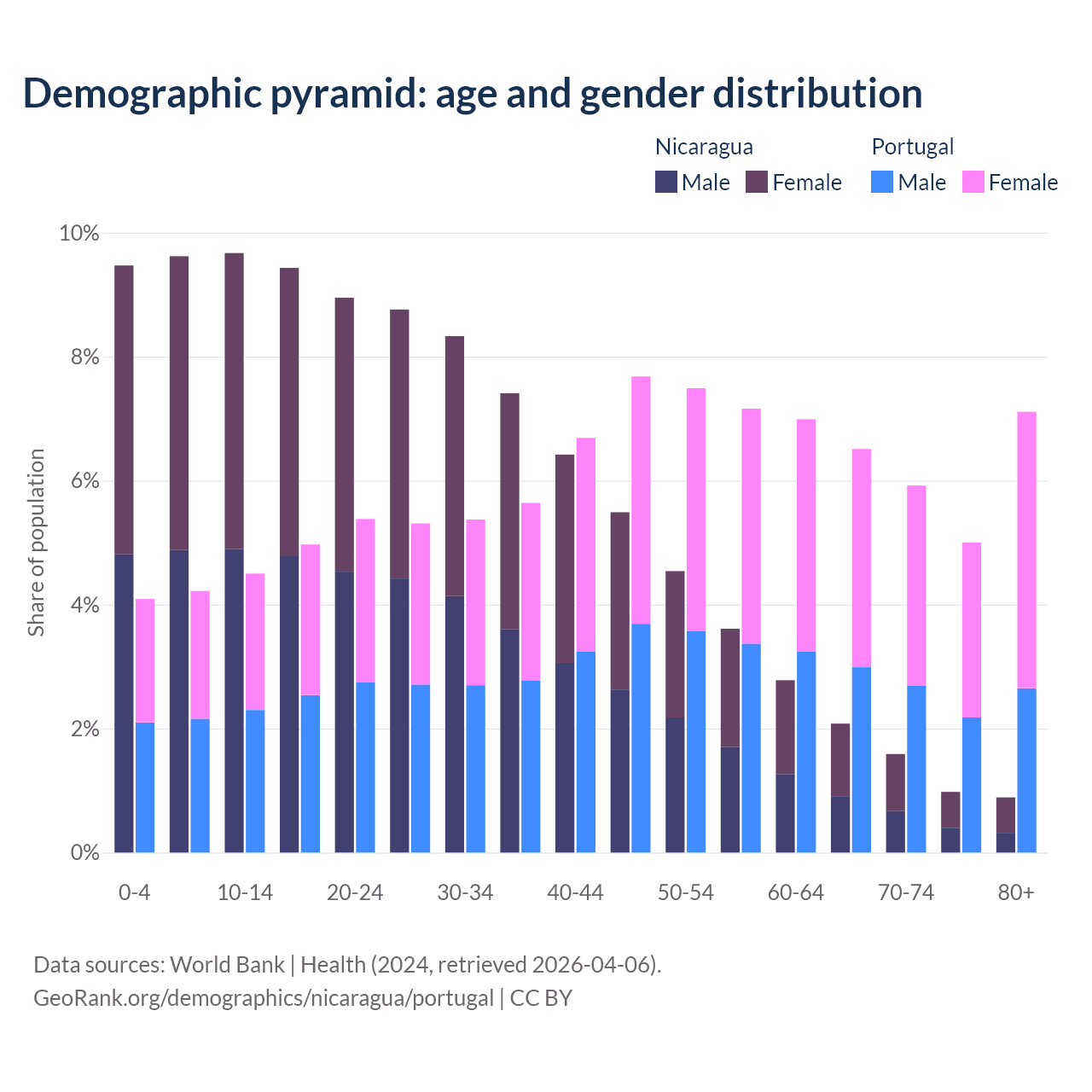 - The share of old-age demographic (65+) in Nicaragua is 5.53% vs 24.5% in Portugal.