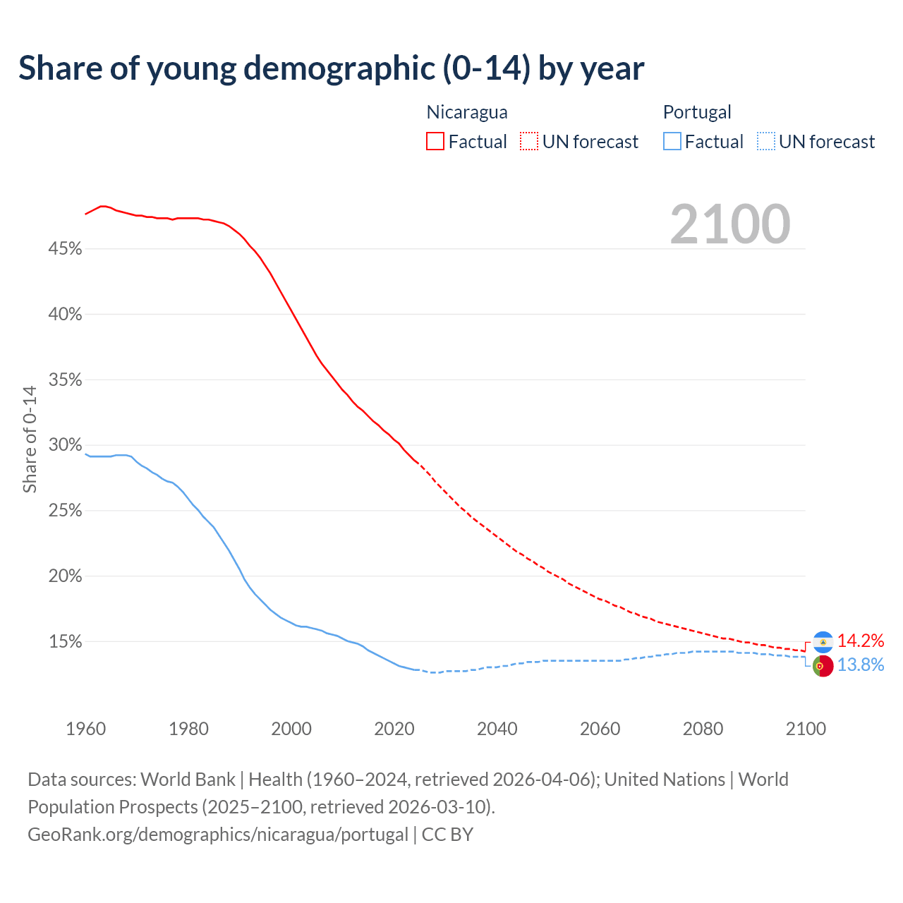 - The share of young demographic (0-15 years old) in Nicaragua is 28.8% vs 12.8% in Portugal.