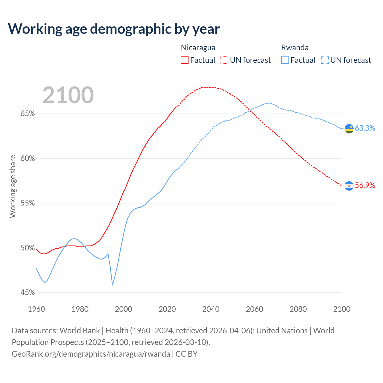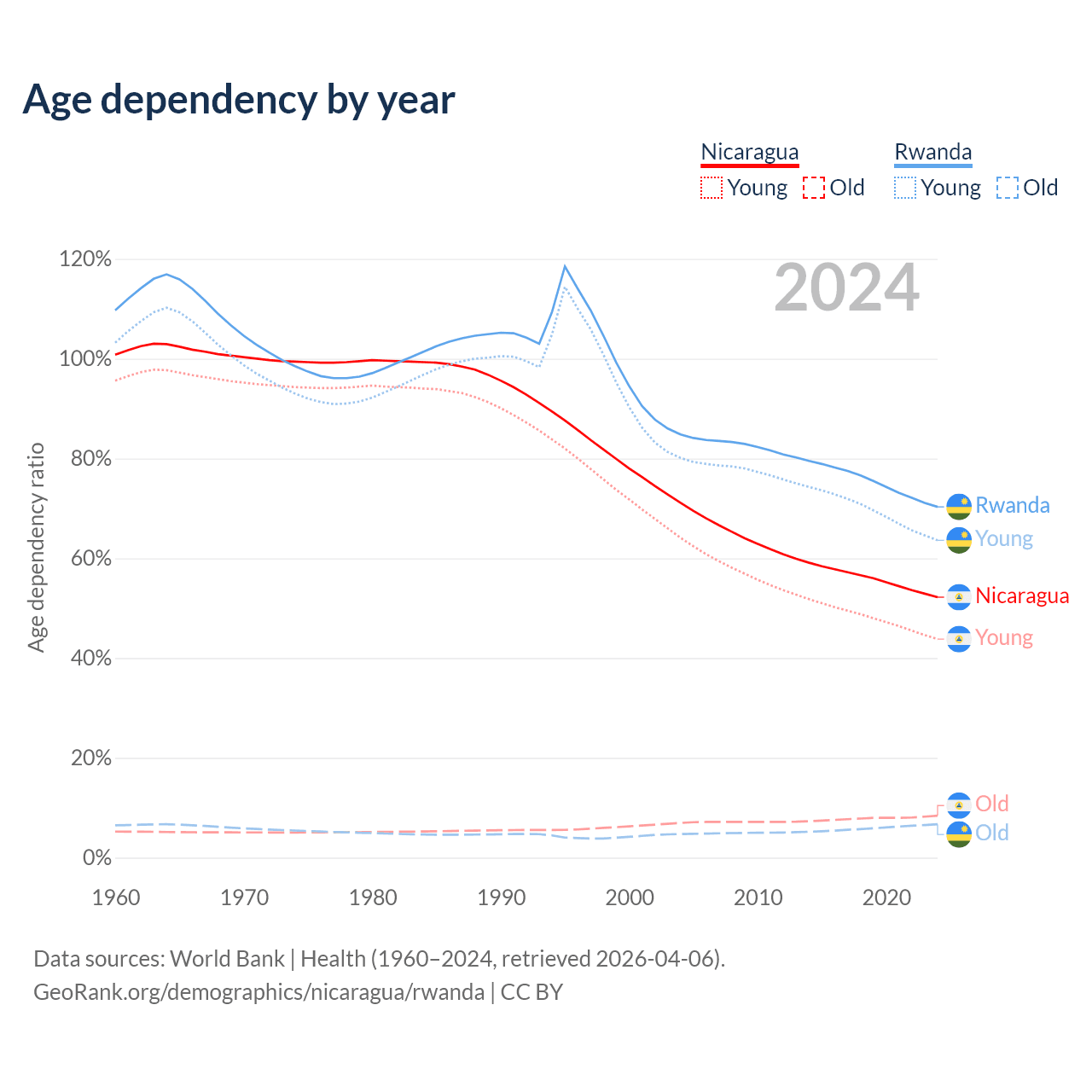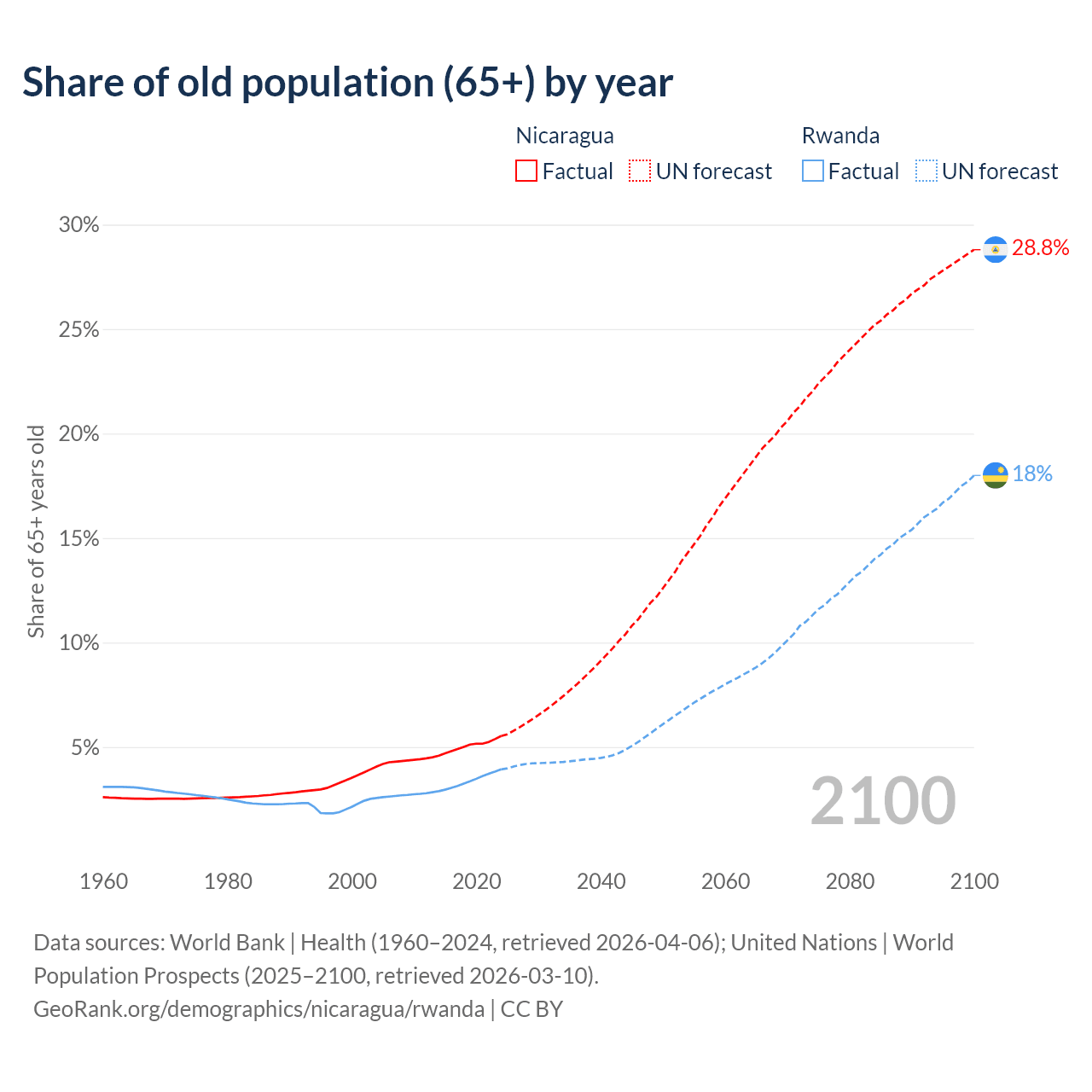 - The share of old-age demographic (65+) in Nicaragua is 5.53% vs 3.93% in Rwanda.
