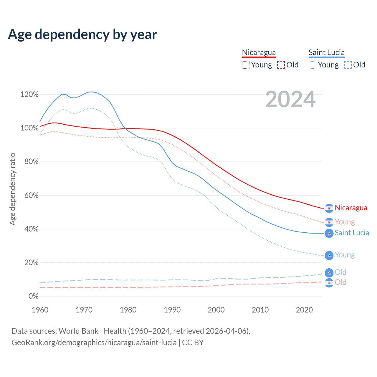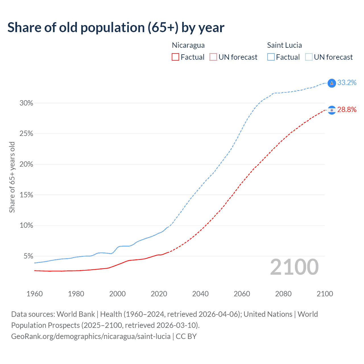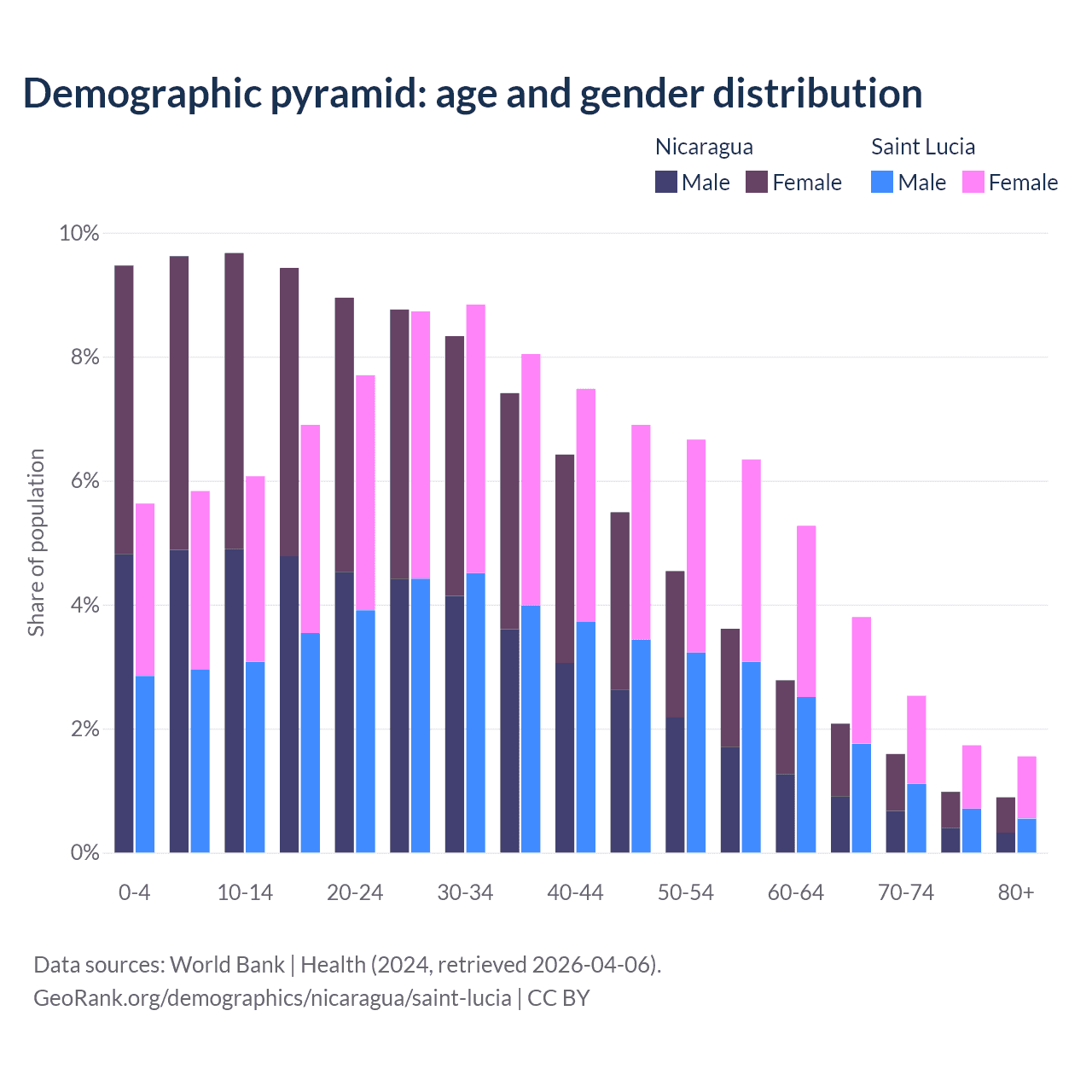 - The share of old-age demographic (65+) in Nicaragua is 5.53% vs 9.62% in Saint Lucia.