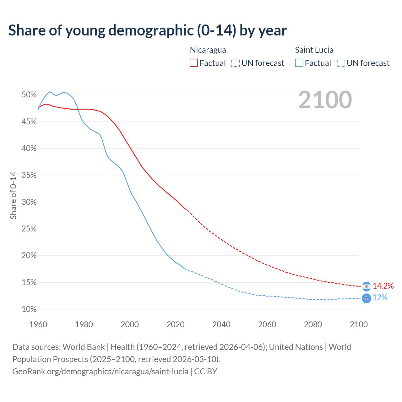 - The share of young demographic (0-15 years old) in Nicaragua is 28.8% vs 17.5% in Saint Lucia.